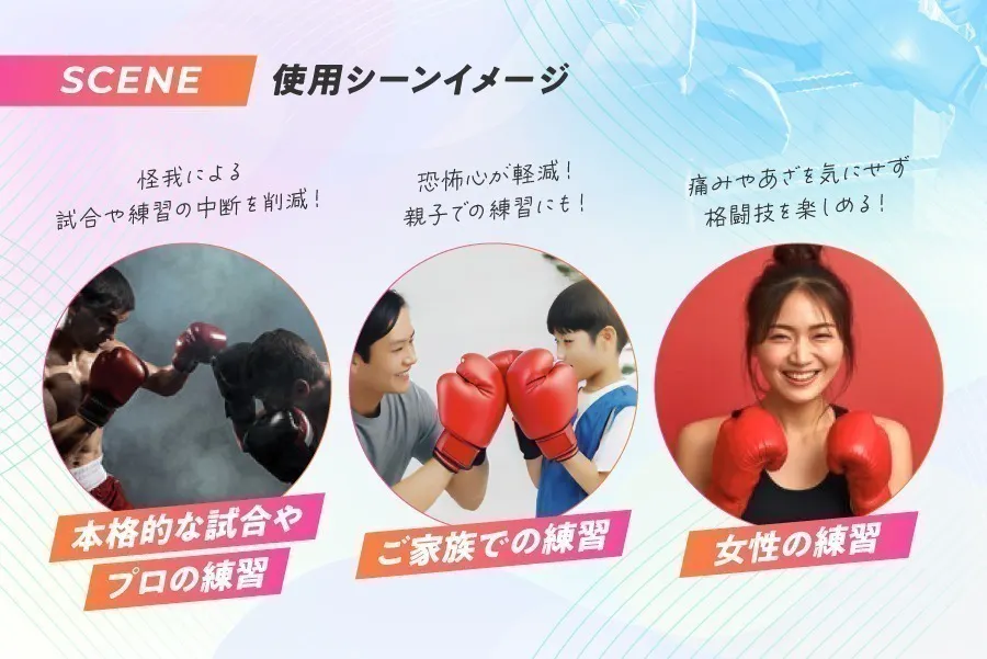 また、骨折や皮膚カットなどの怪我やダメージを最小限に抑えつつ、普通のグローブ同様にノックダウンは起こせる構造を維持することで、実戦的も保持しています。