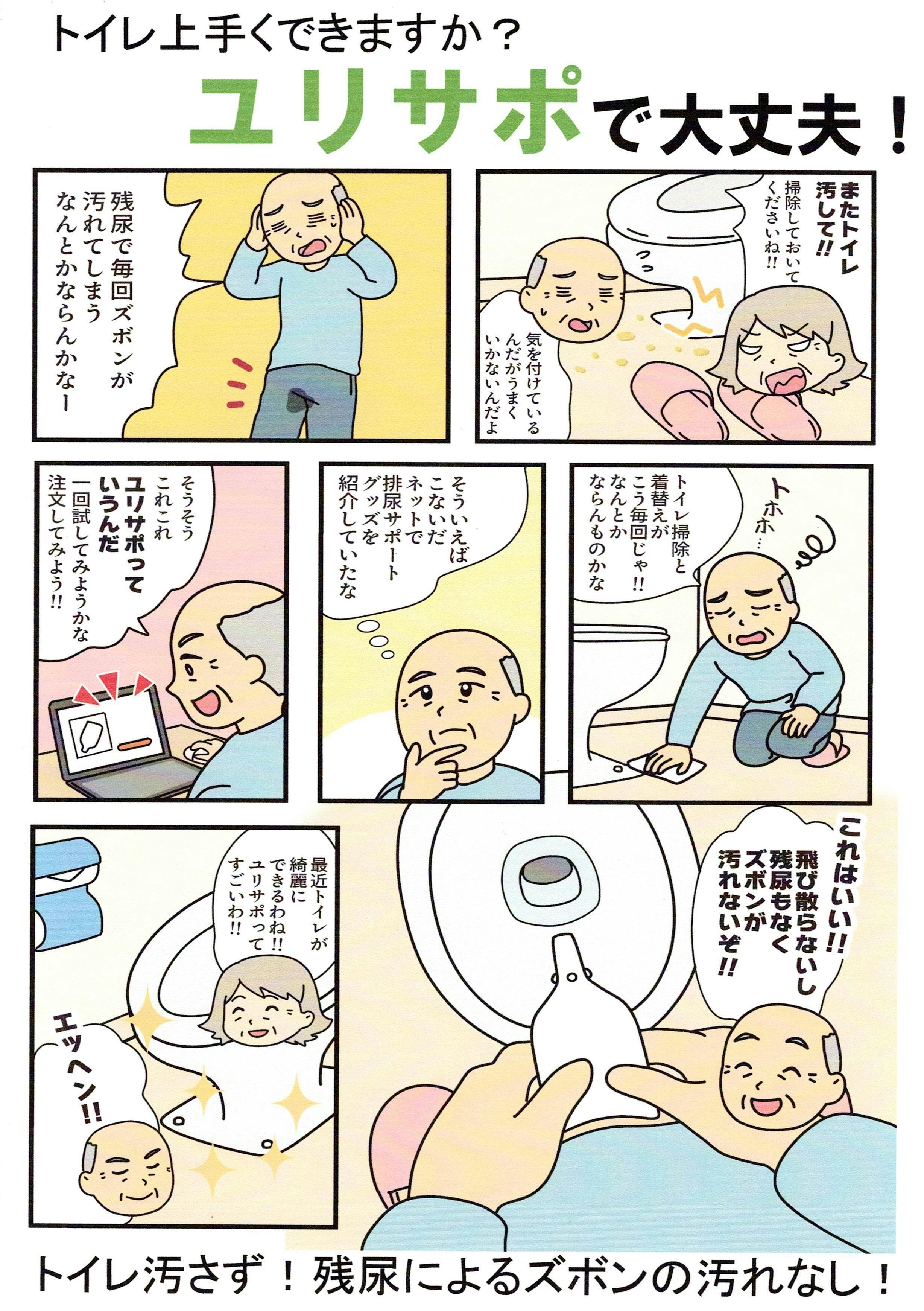 わたくしはユリサポを一日に10回以上使用しています。まず、妻に怒られることがなくなります。また、トイレ汚れを掃除したり、残尿による衣服の汚れから解放され、放尿に勢いの衰えた高齢男性には必需品だと思っています。