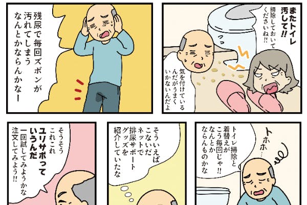 •65歳ぐらいからの排尿障害による便器にうまく排尿できなくなりトイレを汚したり、残尿で衣服にシミを付けたりしてしまいます。