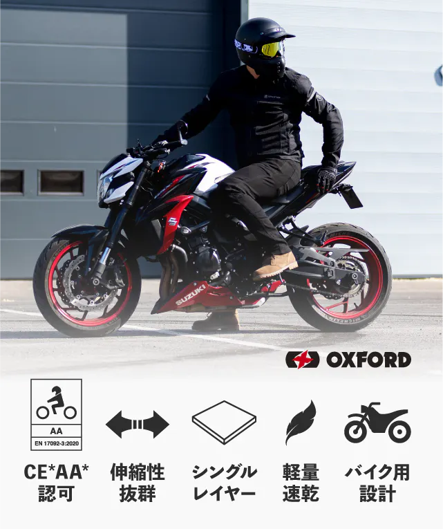 プロのライダー向けのプロテクション性能を持ちながら、伸びて履きやすく、軽量なバイカー用デニムパンツ「スーパーストレッチジーンズ」生地全面CE*AA*を取得している独自素材アーマライトをシングルレイヤーで使用。強さ・軽さ・見た目の良さを同時に実現しました。