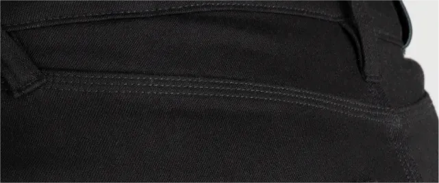 スーパーストレッチジーンズは、高速道路での走行にも耐えるようCE*AA*を取得した独自素材であるアーマライトをシングルレイヤーで全面に使用しています。