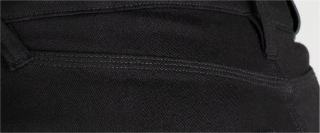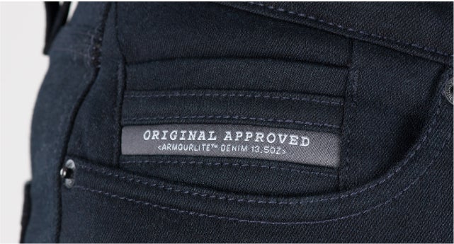 スーパーストレッチジーンズは、高速道路での走行にも耐えるようCE*AA*を取得した独自素材であるアーマライトをシングルレイヤーで全面に使用しています。