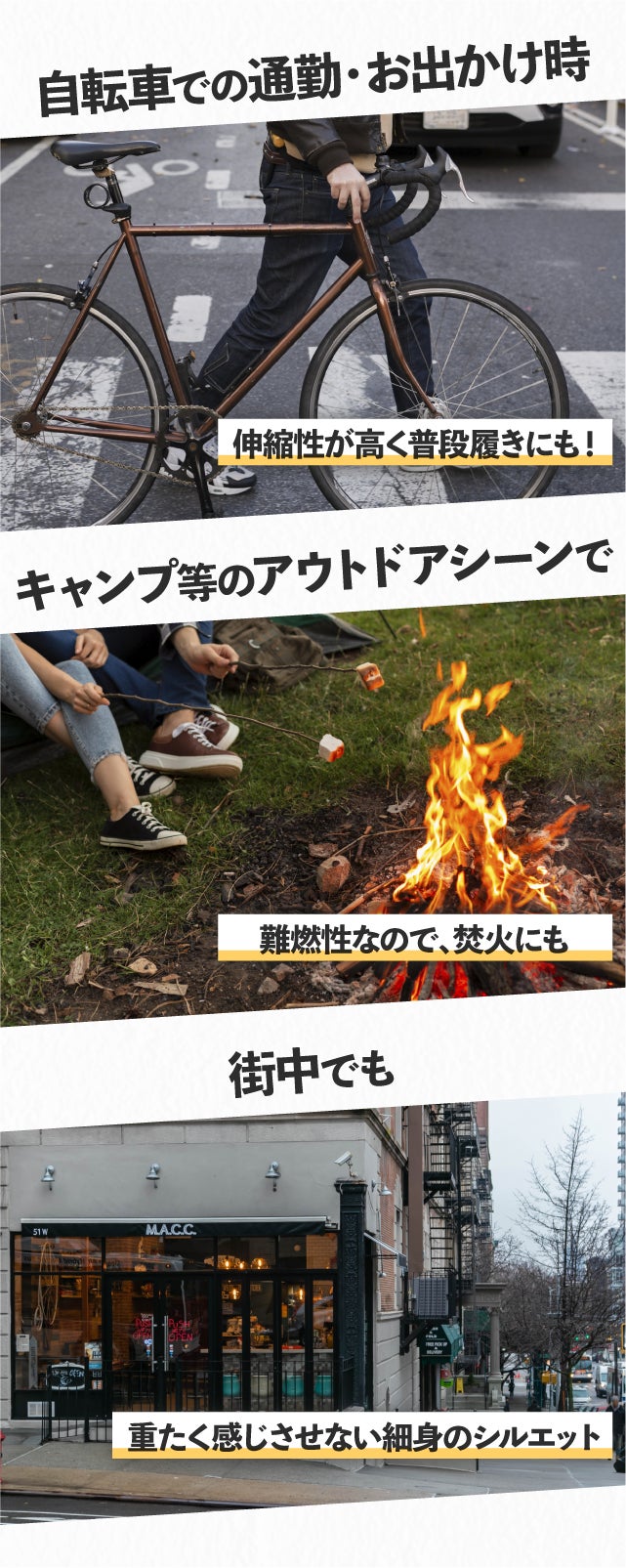 スーパーストレッチジーンズは、プロのライダー相当のプロテクション性能を実現させながら、タウンユースにも違和感のない細身のシルエット・履きやすさを実現させています。