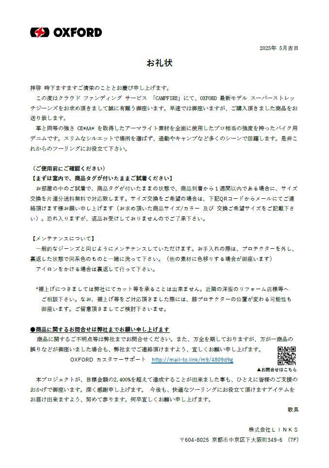 2025/05/13 09:02サポーターの皆様いつもお世話になっております。LINKSの森本でございます。おかげさまで、5月11日にOXFORD スーパーストレッチジーンズ プロジェクトを無事に終了することが出来ました。140本を超える商品を販売出来ました事も、皆様のご支援のおかげで御座います。感謝申し上げます。本当に有難う御座いました。商品発送につきまして、5月15日(木) ~20日(火) にかけて順次対応させて頂く予定で御座います。発送完了の際には、別途ご連絡させて頂きます。商品到着まで、もうしばらく、お楽しみにお待ちください。何卒宜しくお願い申し上げます。株式会社LINKS担当 森本 もっと見る