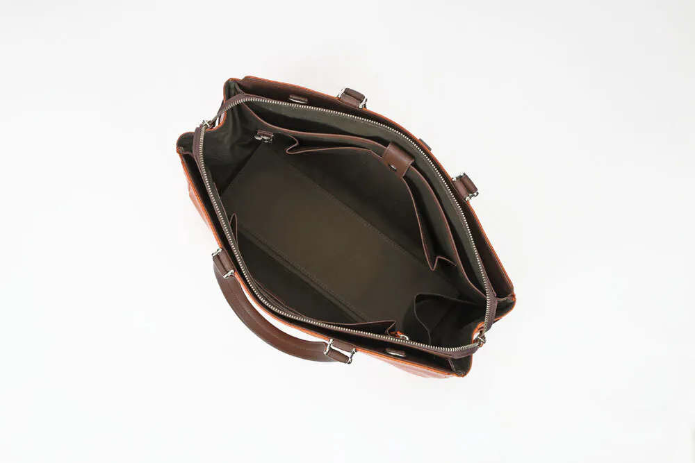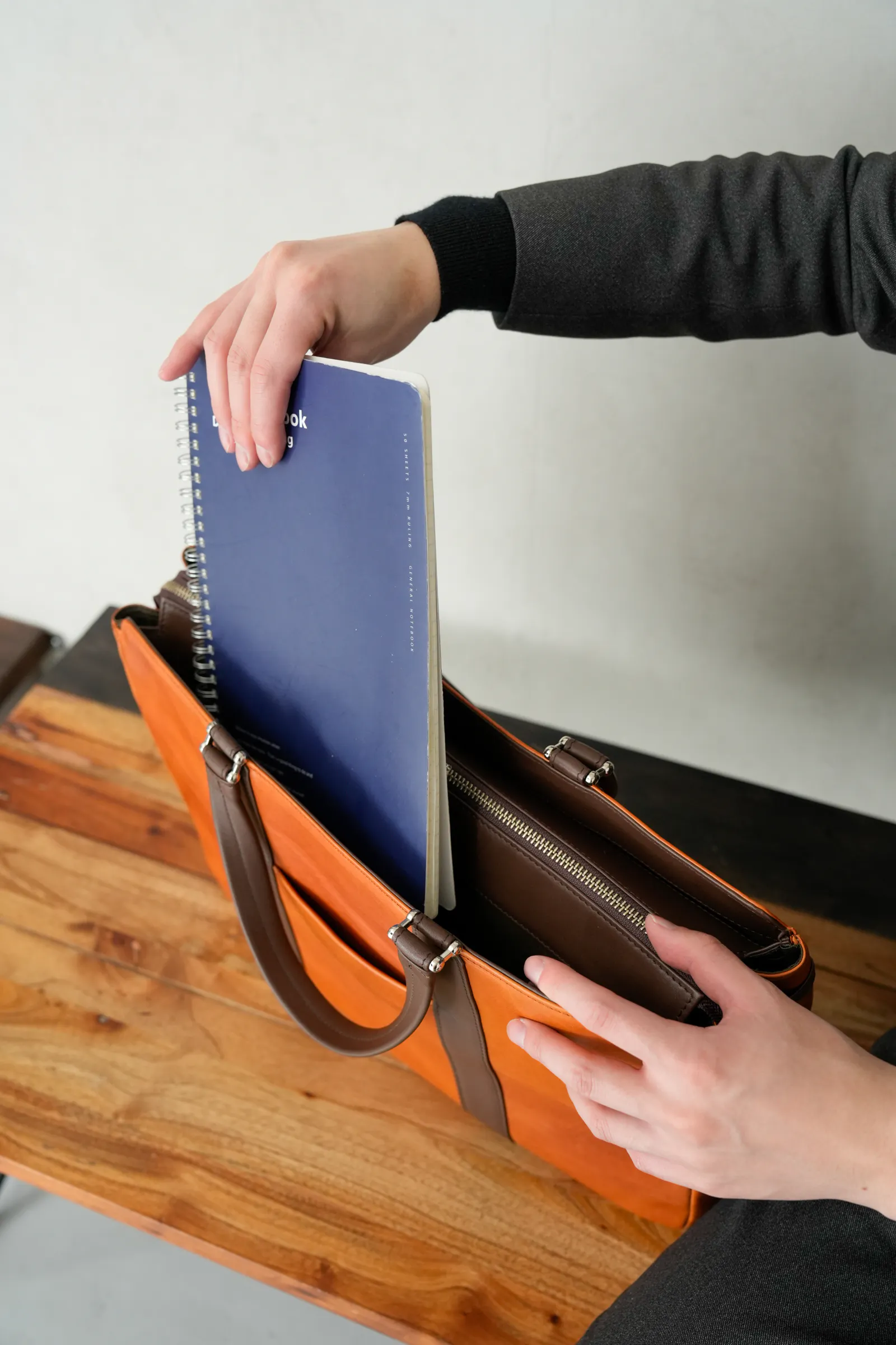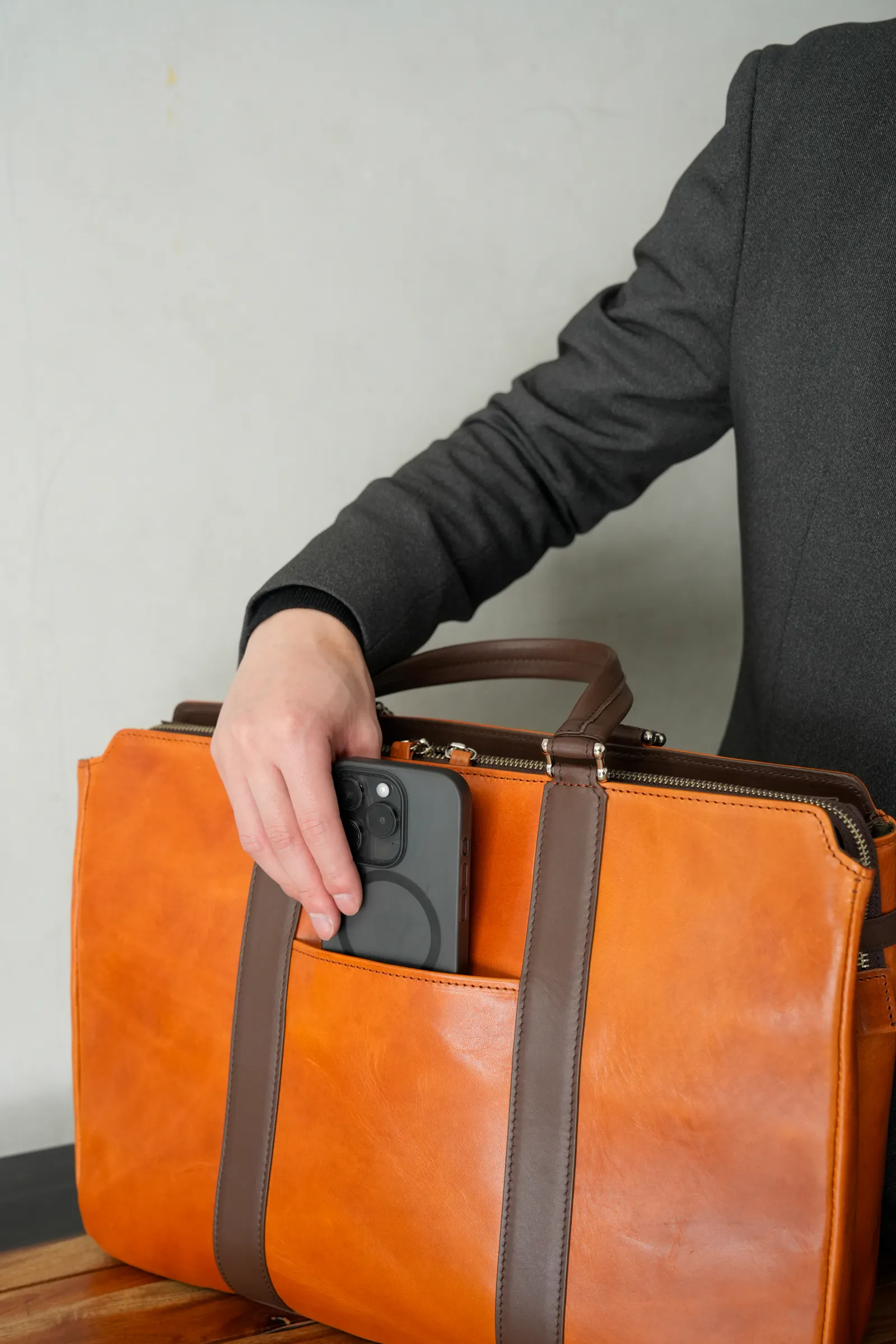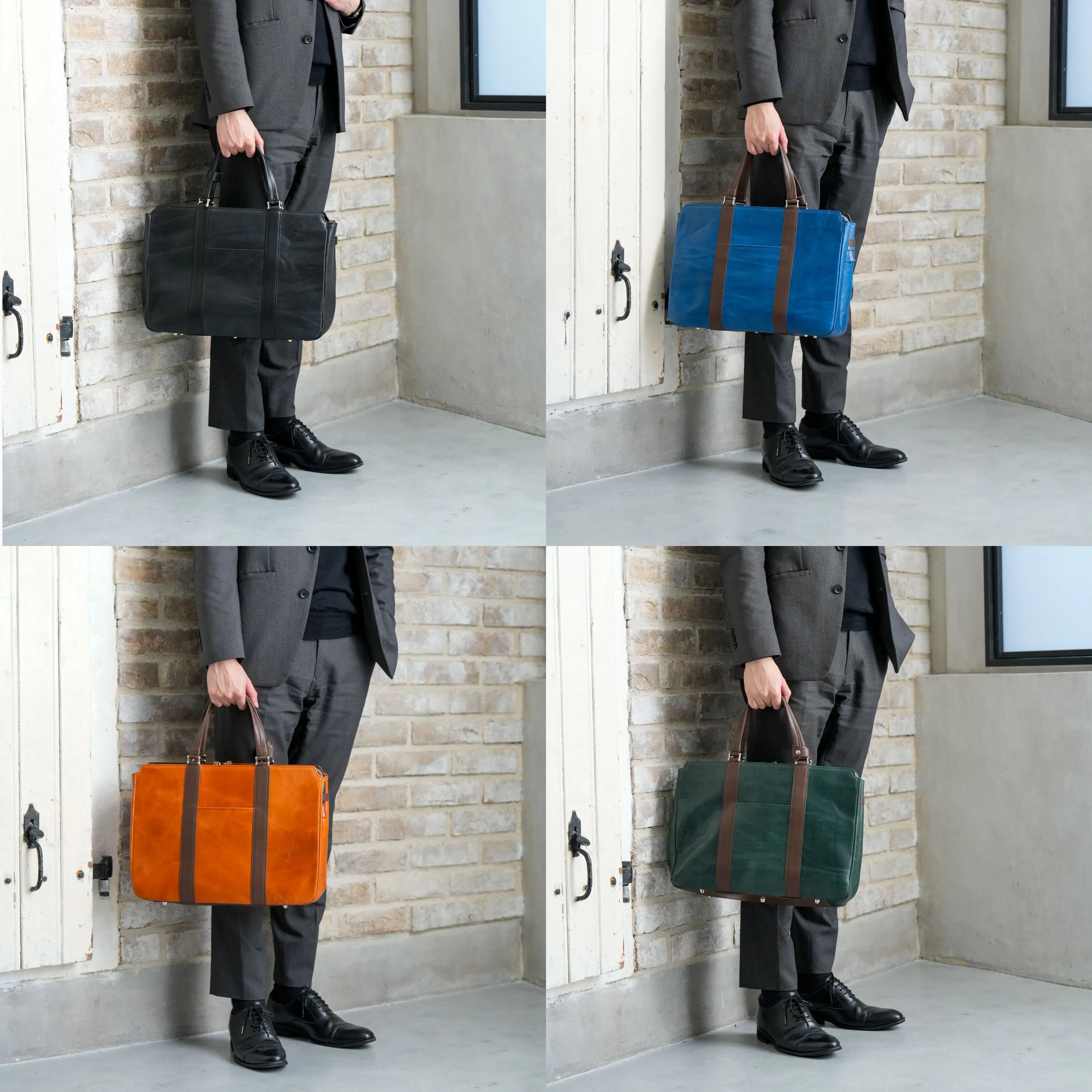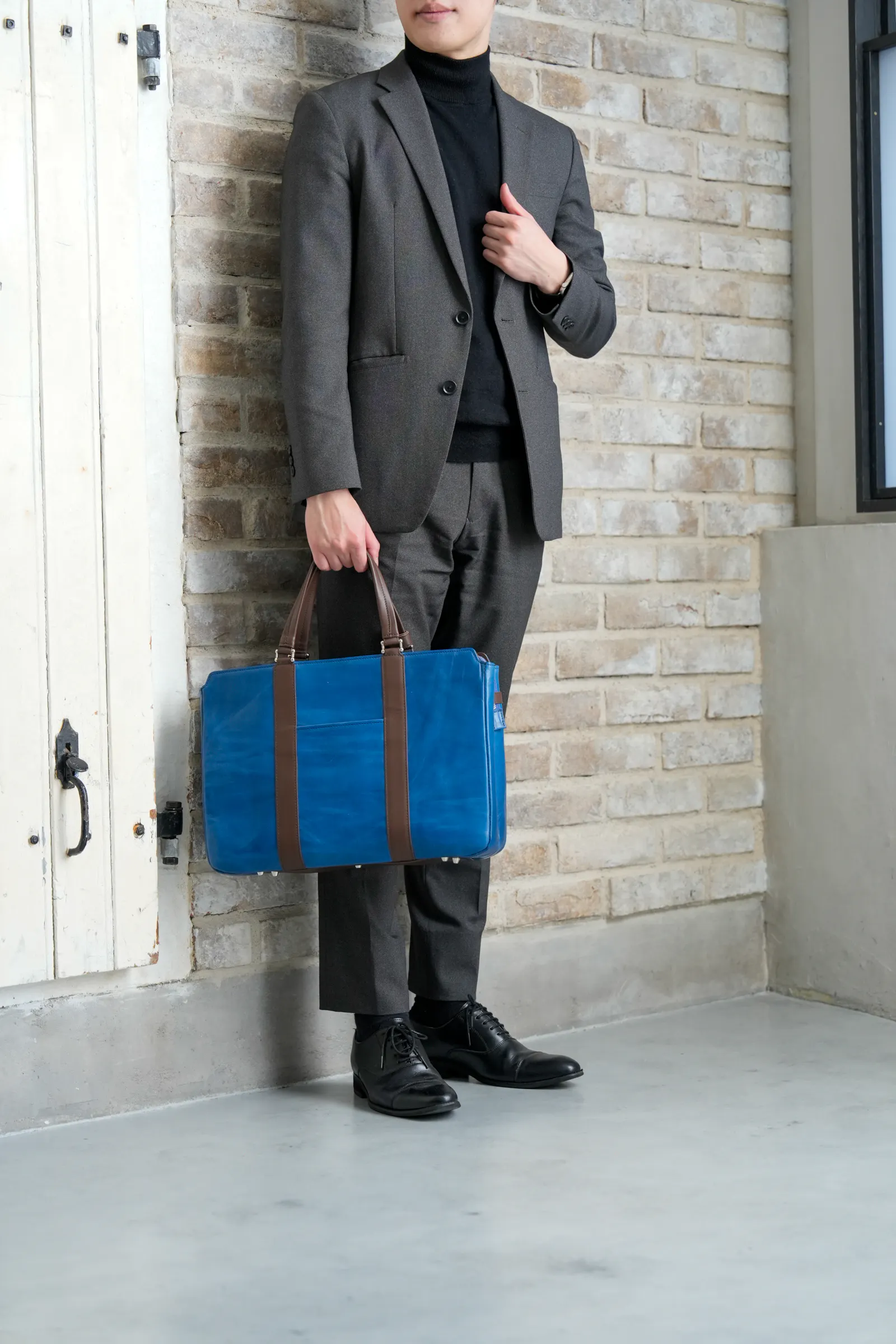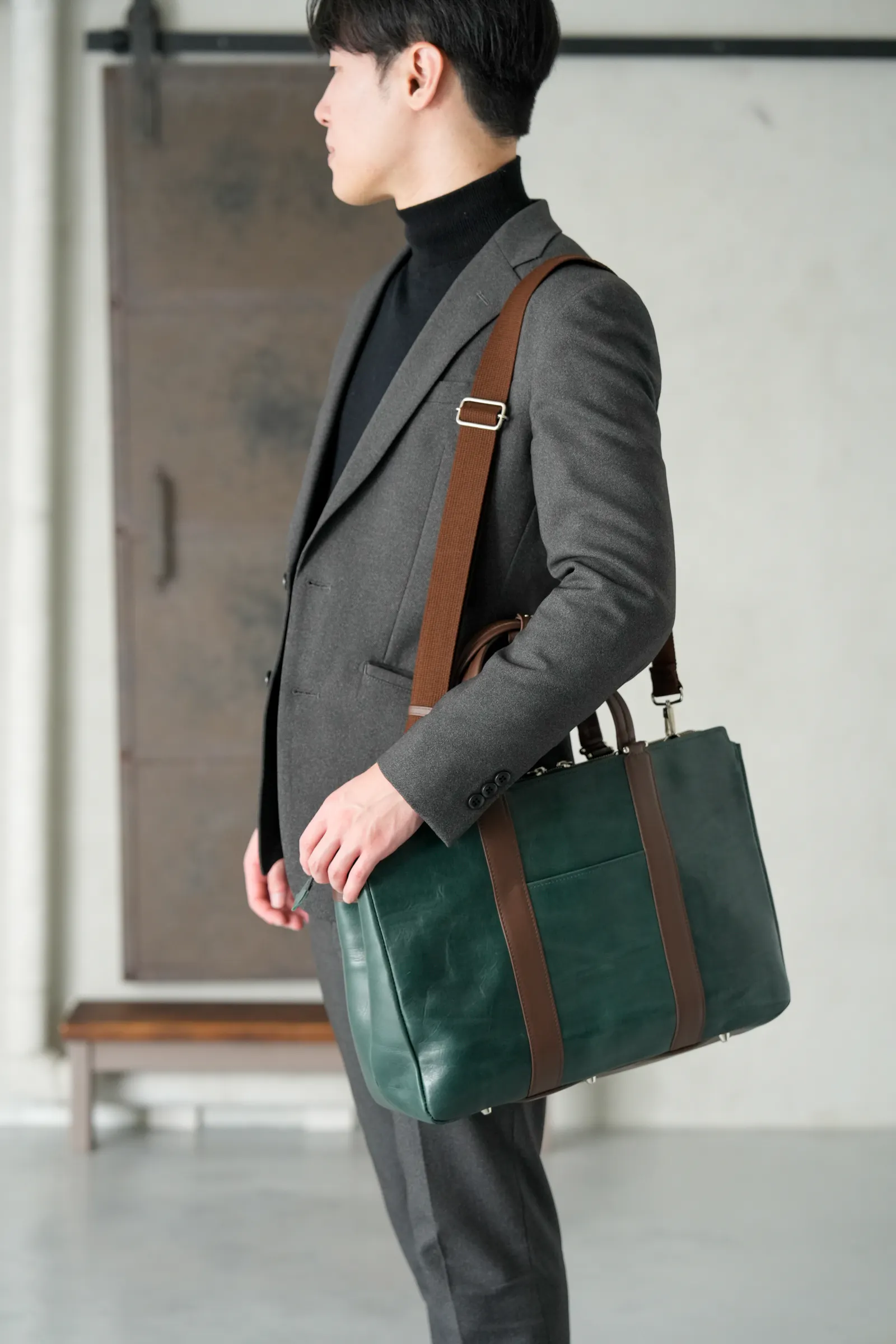一般的なビジネスバッグといえばナイロン製がほとんどで今や百貨店やセレクトショップでもなかなか牛革製のものを見ることが少なくなりました。今回のバッグは素材にもこだわり、上品なだけでなく、タフな雰囲気も兼ね備えました。