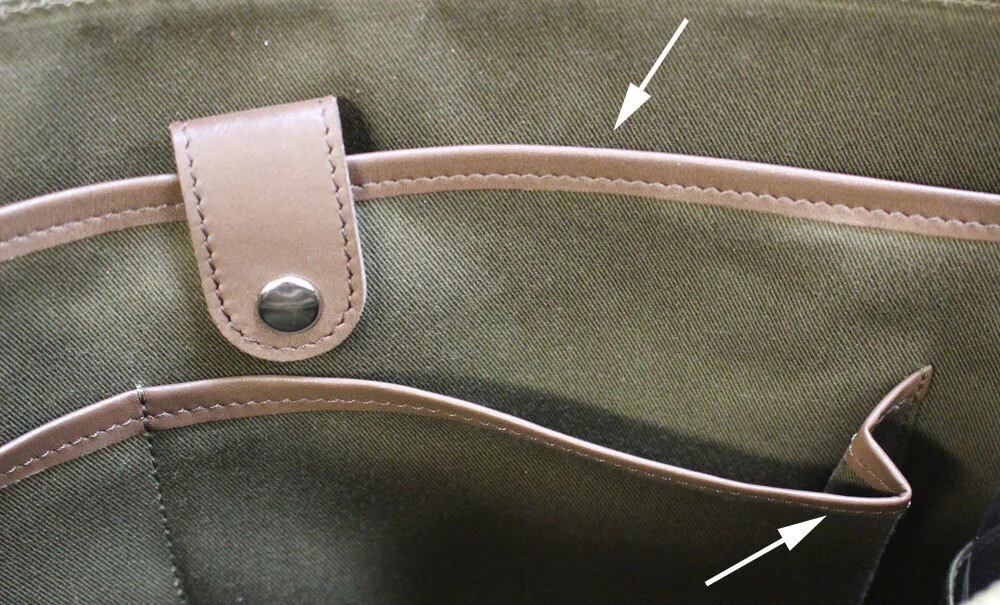 各ポケットの口元はすべて革を巻いています。高級感が増すのはもちろんですが、物の出し入れがしやすく、生地の端がほつれにくくなります。また各オープンポケットはタックを取っているので厚みがあるものも入れて頂けます。
