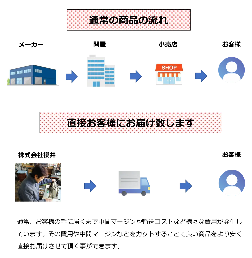 企画/デザイン~製造/お届けなど全ての作業工程を一貫して行っております。直接販売だからこそ、お客様より頂く直接のお声やご要望をすぐに反映させることもできます。