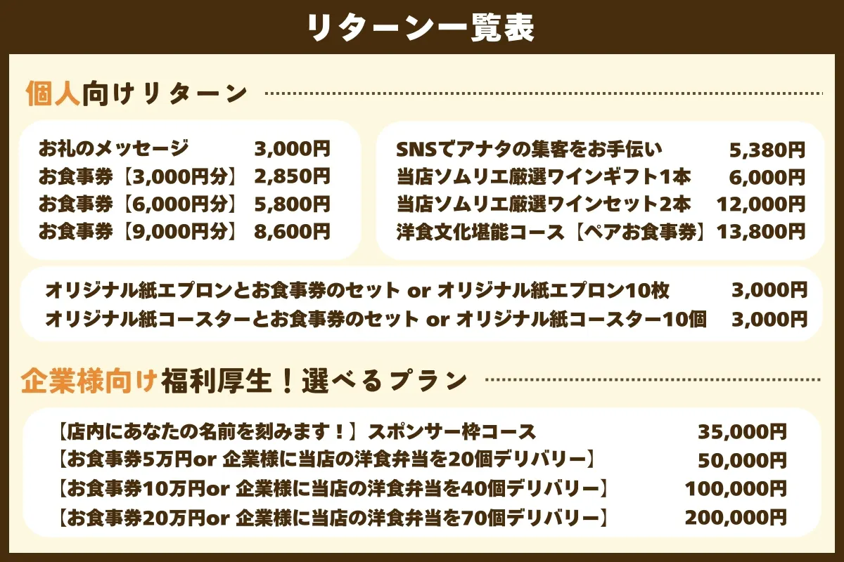 今回、実際に来ていただける方にはお食事券、遠方の方にはワインやグッズ、企業様には福利厚生として社員さんにつかっていただける洋食弁当のデリバリーのリターンをご用意させて頂いました。