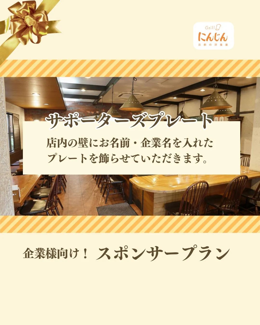 2025/05/04 21:47本日もお客様のご来店ありがとうざいます。先日2社様からスポンサープランのご支援頂きました。本当にありがとうございます。6月中にはプレート発注し作成して店内のワインショップ内かレジ上部に掲載したいと考えております。経営理念日本伝統の洋食文化を京都から世界に広め日本の食文化の未来に貢献する もっと見る