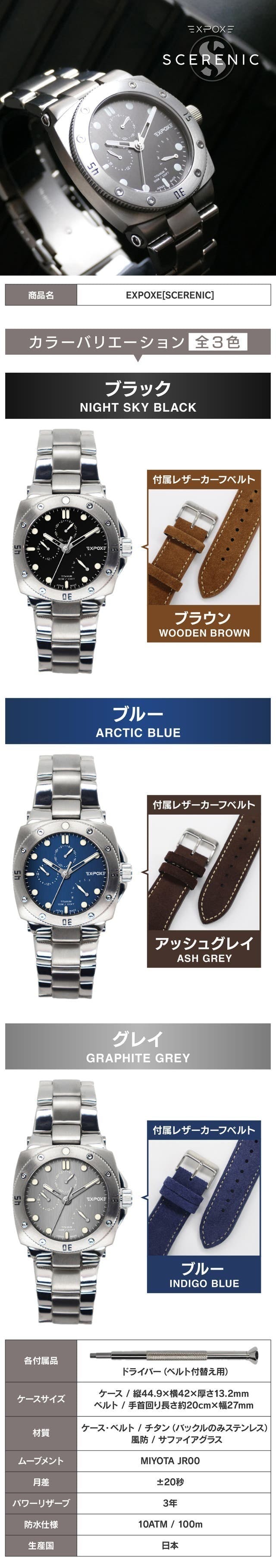 EXPOXE[SCERENIC]はケースとベルトに軽量かつ、堅牢な純チタンを用いた日本製のツールウォッチです。