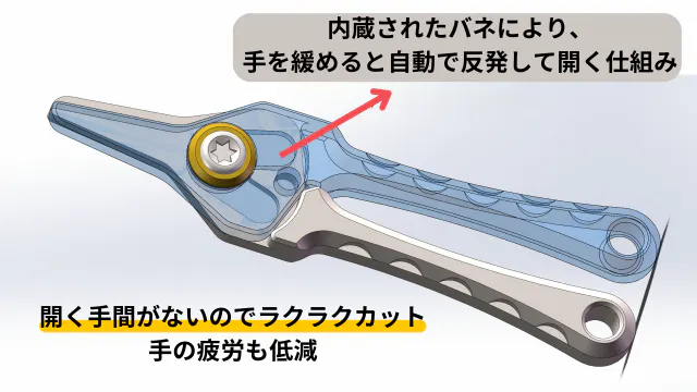 バネを内蔵することで、手を緩めると自動で開くため、戻す手間なくラクラクカットが可能です。