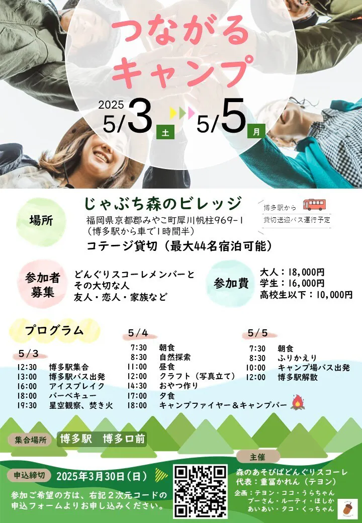 2025/05/21 18:435月3〜5日に福岡県のじゃぶち森のビレッジで、「つながるキャンプ」を行いました!このキャンプは年齢も住んでいる場所も仕事も何もかも違うメンバーで集まって交流したいという思いから生まれました。その思いの通り、九州だけでなく、中国地方、関西、関東からも参加者が集まりました!そしてなんと最年少は0歳11ヶ月!幼稚園生、高校生の参加者もありました♪1日目は、バスで約2時間かけてキャンプ場へ…車内はバスレクで大盛り上がり!「あ」で始まって「ん」で終わるなるべく長い言葉を探そう!というゲーム等たくさんのゲームをしました!ついてからはアイスブレイクも兼ねて、「トークフォークダンス」を行い、順番に1対1で1分間ずつのお話をしました。始めは恥ずかしそうだったみんなも次第に打ち解け、1分が短く感じてきたようでした。今回キャンプが初めての子もおり、薪割りや火おこしなど経験者が優しくレクチャーする場面も!薪割職人がたくさん誕生しました笑そして夜はバーベキュー!マジックソルトにつけた手羽元がジューシーで最高でした〜2日目の朝食はおにぎりと味噌汁!ほっと一息ついたあとは、朝の体操!まさかのAPTをみんなで踊りました!その後のウォークラリーでは、班に分かれ①一番大きな葉っぱ②面白いorかわいいorすてきな石をそれぞれ探し、絶景ポイントで写真を撮ってくるというミッションの元、それぞれが交流会を深めました!お腹もペコペコになった頃、昼ごはん!みんなで開催地福岡のご当地料理であるかしわ飯をつくりました!火起こしが初体験の参加者も多かったですが、気がつくと既に火のトリコに…♡火バサミをぎゅっと握りしめ、火と格闘していたのでした。そして、クラフトのお時間!粘土やビーズなどを使って、オリジナルの額縁を作ろう!ということで、みんなの才能が爆発しておりました!!おやつは柏餅と八女茶!あんこを包むのが難しかったけど、自分で作ったおやつは格別♪晩御飯は餃子と塩焼きそば!!いただきますの直後から、「うまっ!」「おいしい〜!」の声がとまりませんでした!美味しさを共有できるのって最高だー!!そして、みんな楽しみにしていたキャンプファイヤー!みんなで歌って踊って、子どもも大人もはじけました!!2日目の最後は…なんとキャンプバー焚き火に照らされながら、ワイングラスに好きな飲み物とアイスを入れて楽しみました♪3日目の朝ごはんはたい焼き!!中身はアンコではなく、ハムエッグとハンバーグチーズ!もうこれが美味しいのなんの!!コーヒーも淹れて、最後の朝を楽しみました!今回、たくさんの方のご支援や応援があってのキャンプ開催ができたので、メンバー一同改めて感謝の気持ちでいっぱいです。以下は、代表テヨンからの言葉です。私はこの3日目で、たくさんの感情と出会いました。初めての人と会うことのドキドキ、少しずつ仲良くなっていくことへのワクワク、知らない世界を知ることへのキラキラした気持ち、そして「仲間」ができるほっこりした気持ち。そして、不思議な気持ちにもなりました。このキャンプはみんなの交流を目的に企画したキャンプ。もちろん、このつながりが続いていくことはすごくいいことなのです。でも未来につながっていっても、いかなくてもいいと思いました。ただみんなでご飯を食べ、笑い合い、つながったこの一瞬が、未来につながっていくかなど関係なく、人生において最も輝かしいものの一つなんじゃないかなとふと心に湧いてきました。日々生きていると、利害や様々な立場、これからのことを考えざるを得ないような気がしています。でも、「この一瞬」のことだけ考えることができたあの体験は生涯忘れることはないなと思います。また、解散式では、一人一言お話をしてもらいました。みんな口々にこの3日間の思い出を語りました。その中で一つ共通していたことが…それははじめキャンプに参加するのをとても迷っていたこと。初対面の人とキャンプか…遠いしな…緊張する…子どもが…などなど、いろんな思いを抱えて参加してくれていたのです。「でも参加して本当によかった!!」口々にそう話すみんなの顔は、とっても安心したような表情で、忘れられない光景です。企画や当日運営に関して、もちろん反省点もたくさんありますが、「でも企画して本当によかった!!」これからもキャンプを企画し続けたいと思えたキャンプになりました!ありがとうございました。 もっと見る