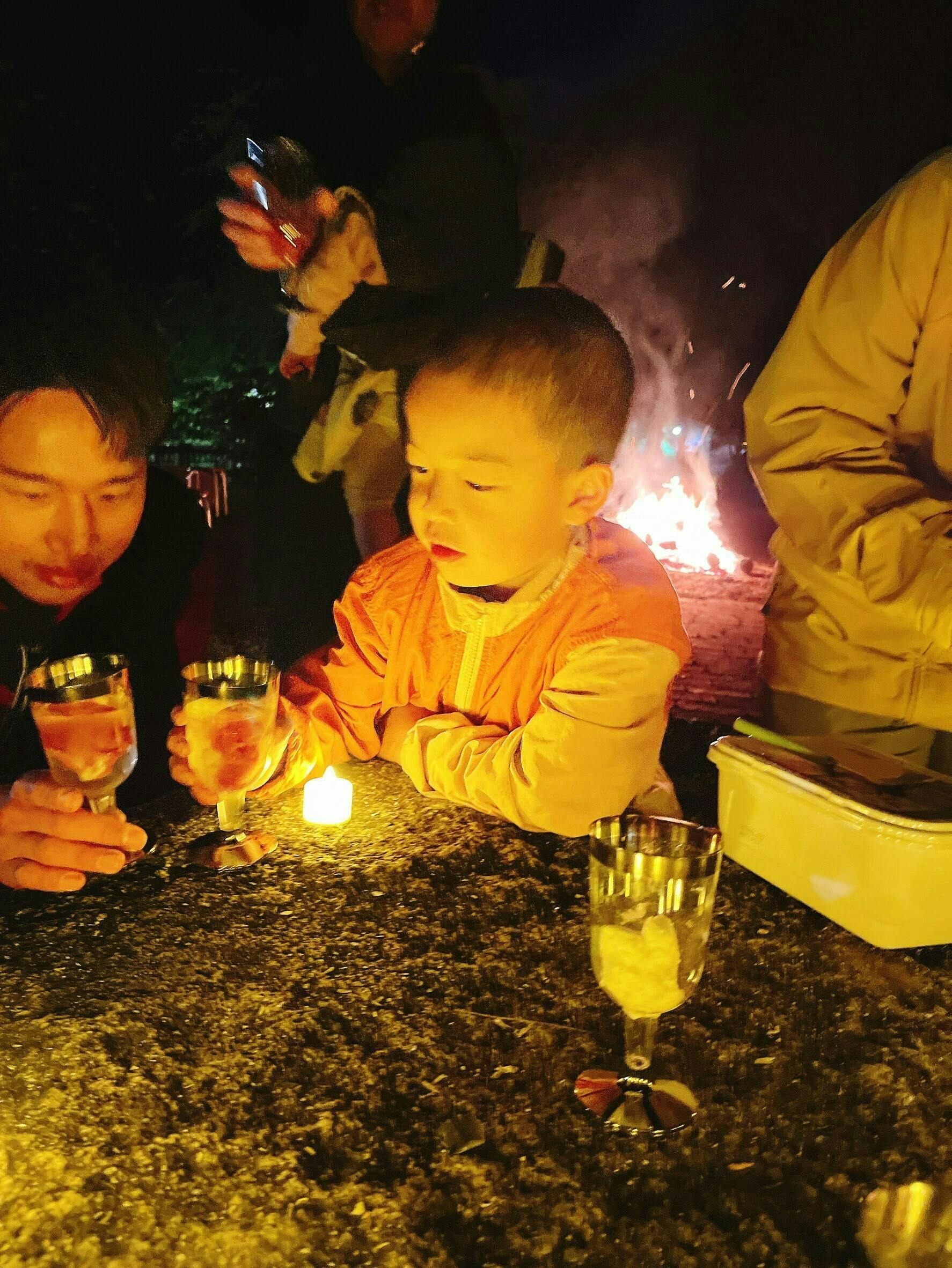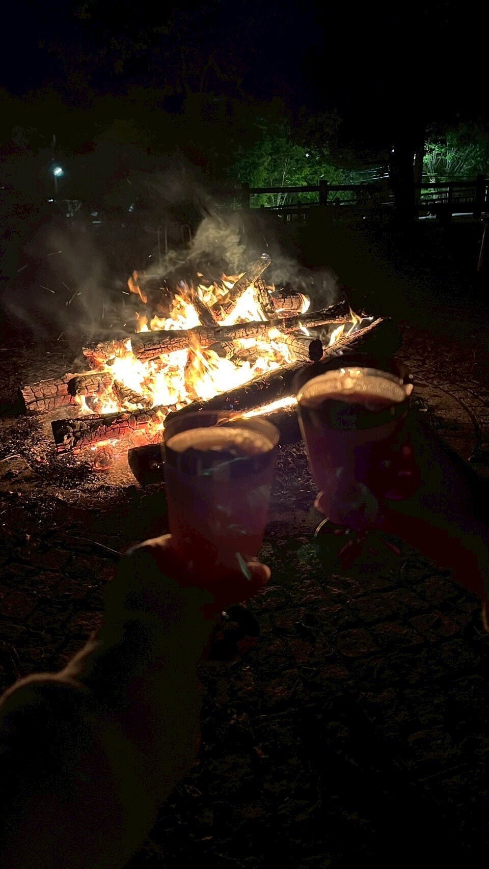 焚き火に照らされながら、ワイングラスに好きな飲み物とアイスを入れて楽しみました♪