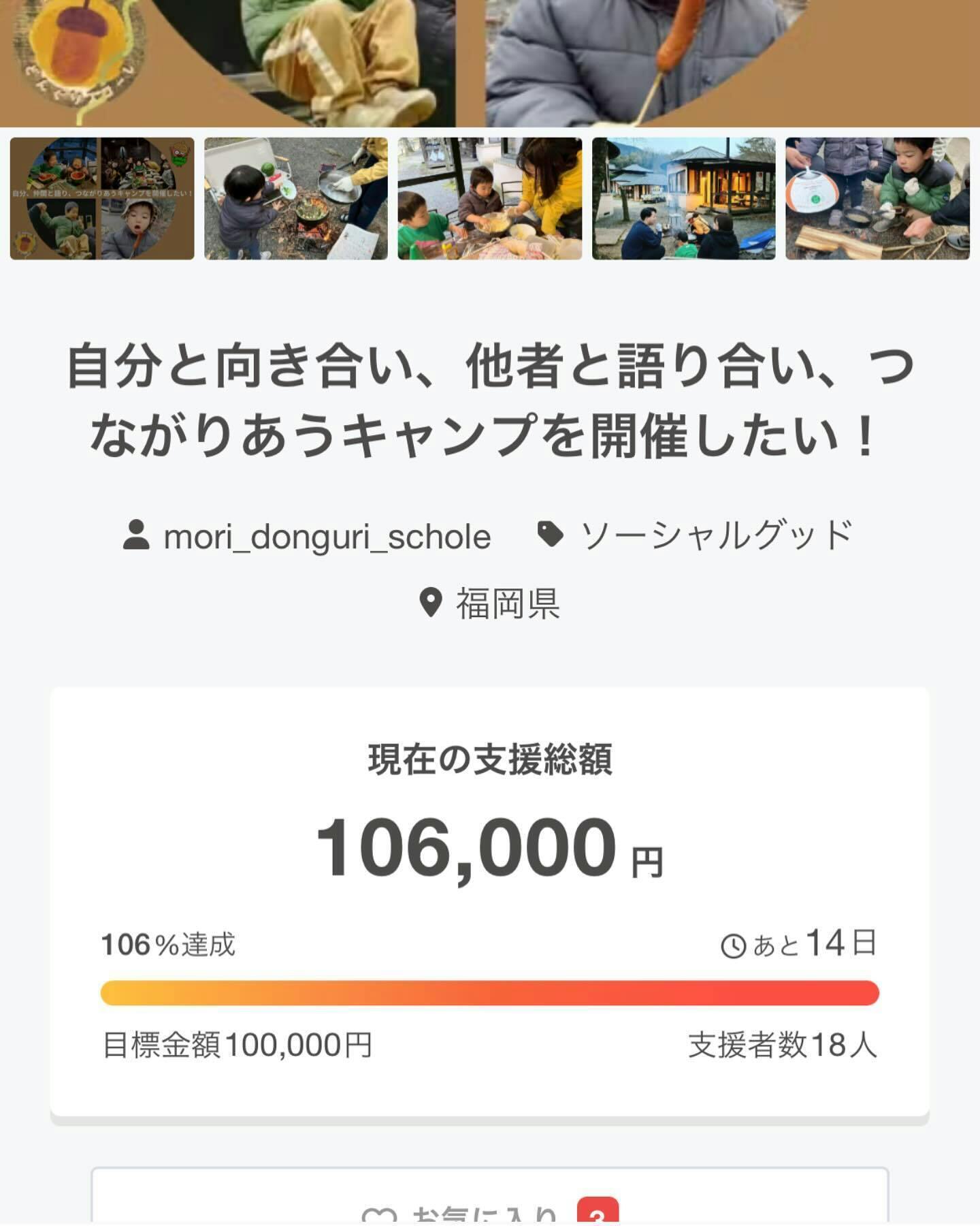 2025/04/06 20:454/6ついに目標金額を達成しました!!応援してくださったたくさんの人へ感謝の気持ちでいっぱいです!募集期間は続くので、目標金額以上集まった場合はつながるキャンプ以外の活動資金や、子どもたちの参加費への補助へ回したいと思っていますので、引き続き応援いただけますと、幸いです!たくさんの応援、ご縁に心がいっぱいです。これからも宜しくお願い致します。 もっと見る