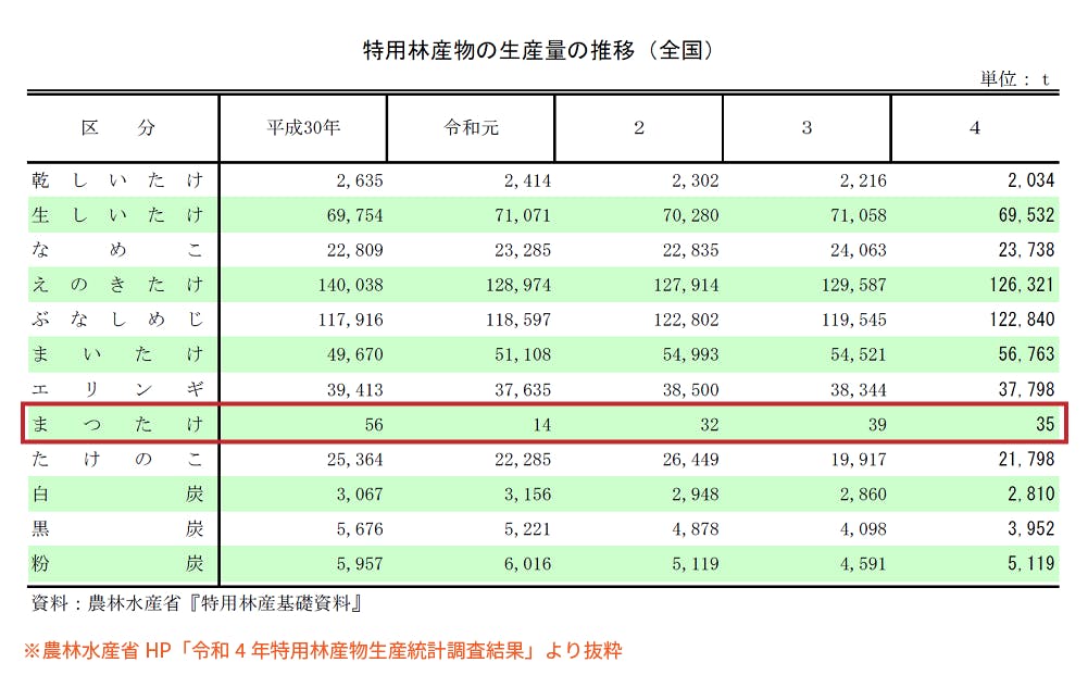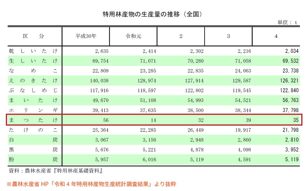 ちなみに同じ期間で、しいたけやなめこなどは安定した生産量を維持しているのに対し、松茸だけが大きく減っているのです。
