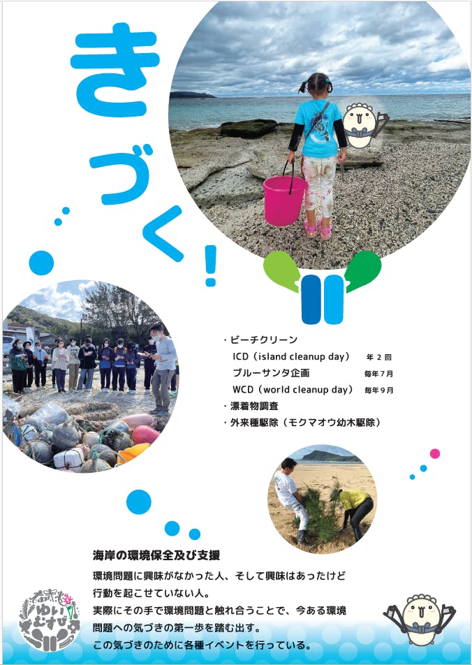 ビーチクリーンや外来種駆除を主とした環境保全活動及びその支援と漂着ゴミ調査を行う。