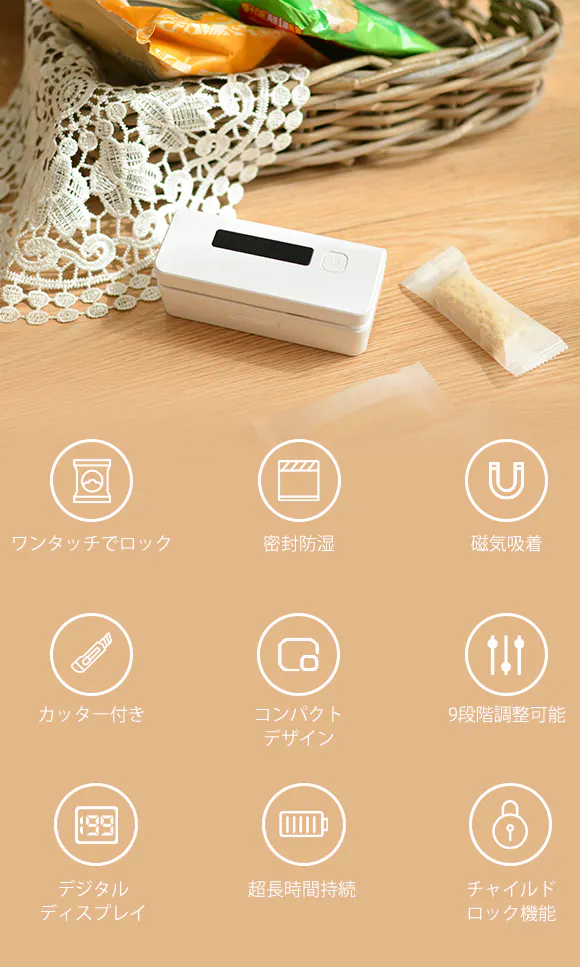 ワンタッチでロックし鮮度を保つミニヒートシーラー「HAKU009」。