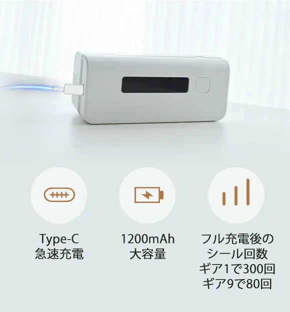 フル充電後は、ギア1で300回、ギア9で80回シールすることができ、耐久性があり、安心してお使いいただけます。