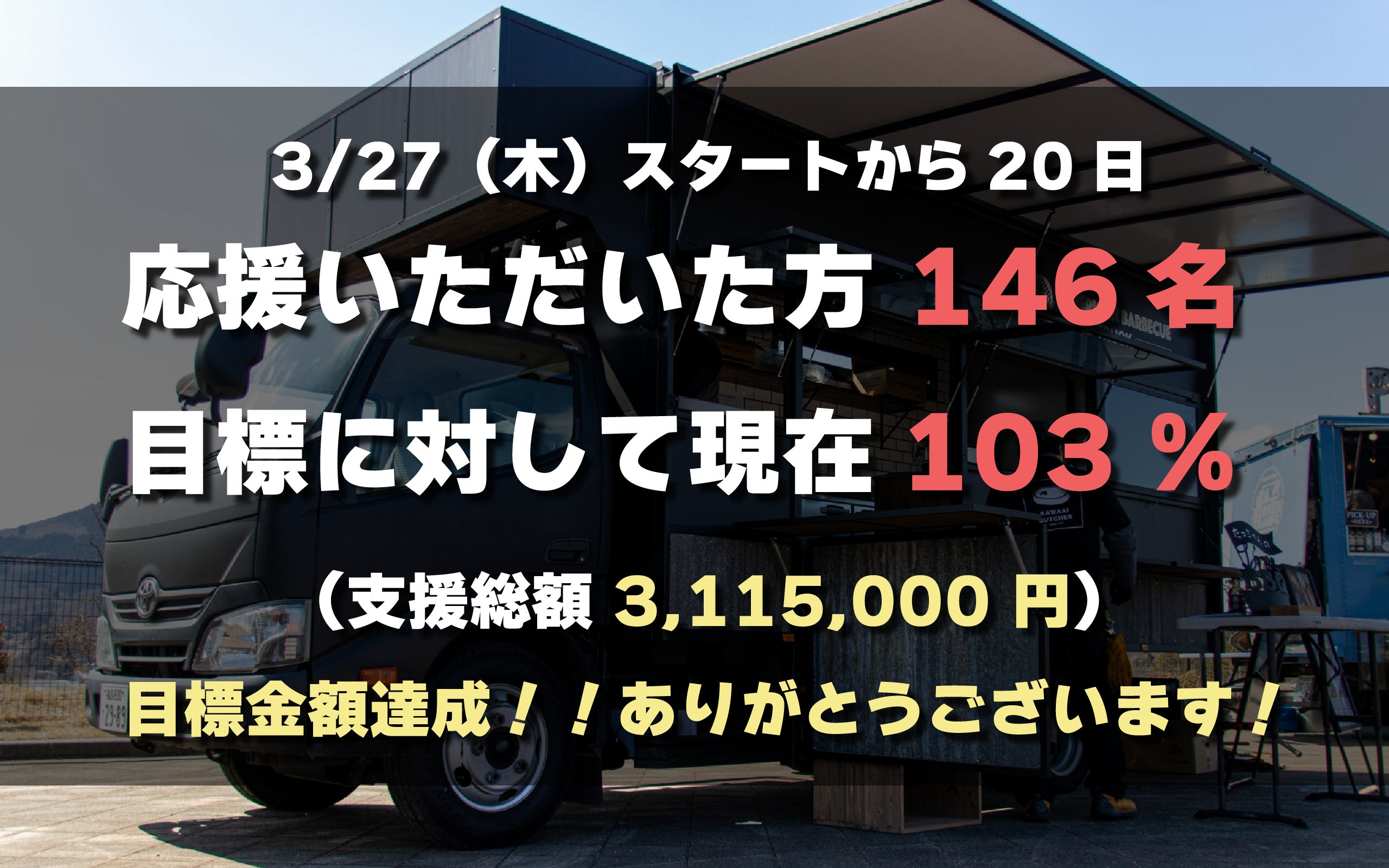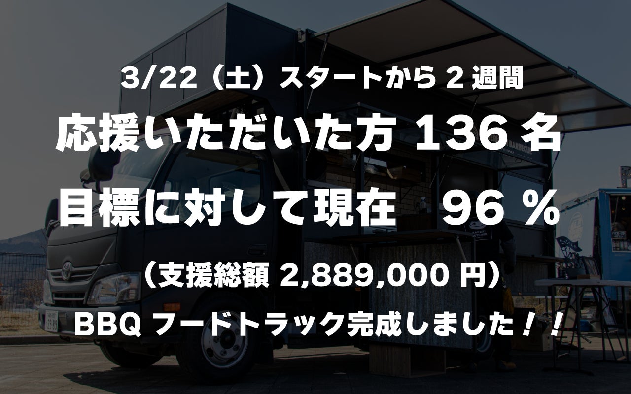 クラウドファンディングをご支援いただいた皆様へこのたびはクラウドファンディングにご支援いただき、誠にありがとうございました。まずは、その後のご報告が遅くなりましたこと、心よりお詫び申し上げます。多忙の中で気持ちに余裕が持てず、ご連絡が後手に回ってしまいました。せっかくご支援いただいたにもかかわらず、このような対応となってしまい、大変申し訳ありませんでした。改めまして、皆様の温かいご支援のおかげで、無事クラウドファンディングを達成することができました。心より感謝申し上げます。◆現在の状況について3月末からフードトラックの稼働を開始しました。初期不良や雨漏りなどのトラブルもありましたが、内装や備品の準備も整い、ようやく安定的に稼働できるようになってきました。現在は、BBQケータリングやイベント出店も少しずつスタートしております。今後も、全国各地で「本物のBBQ」を届けられるよう、日々尽力してまいります。また、ご支援くださった皆様とのご縁を大切にし、より一層気を引き締めて活動していきたいと思っております。◆ご支援への想い皆様からいただいたお名前やコメントも、一つひとつ大切に拝見させていただいております。改めて、個別にお礼をお伝えできればと思っております。また、クラウドファンディングをきっかけに当活動を知っていただいた方で、どこかでフードトラックを見かけた際には、ぜひ気軽にお声がけいただけたら嬉しいです!◆実際に稼働してみて……○作業効率が格段にアップ! まだ備品の定位置が定まっていない部分もありますが、これまでの保冷車移動に比べ、できることが大幅に増えました。効率面でも大きな進歩を実感しています!○見た目のインパクトも抜群! サイズやデザインにこだわった車両は、遠くからでも目を引き、「あれは何だろう?」と興味を持っていただけています。 「ワクワクするBBQ体験」を届けたいという思いを、しっかり形にできたと感じています。芸人のあばれるくんにも気に入っていただきました!○ガスグリルのポテンシャルがすごい! 今回のフードトラックの目玉である大型ガスグリル。 実際に使ってみると、これまでのコンパクトグリルとは比にならない火力! 30人分のBBQケータリングも、この1台でこなせそうです(笑)焼ける量が格段にアップ!メニューの幅も広がりました! ◆リターンについてたくさんのご支援をいただき、5月よりリターン品の準備を進めてまいりましたが、ようやく発送の目処が立ちました。大変お待たせいたしました。これから順次、発送させていただきます。リターンの内容に応じて注意事項がありますので、詳細をまとめたご案内を順次投稿していきます。そちらもぜひご確認ください。ーーーーーーーーーーーーーーーーーーーー今後も活動のご報告をこちらで発信していきます。引き続き見守っていただけますと幸いです。改めまして、この度は本当に感謝申し上げます!