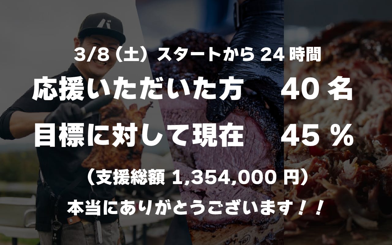 (3月8日時点の投稿となります!遅くなってしまいすいません!)クラウドファンディングをスタートして24時間。スタートからたくさんの応援、本当にありがとうございます!SNSでのシェアもたくさんいただき本当に感謝です!応援コメントは全て目を通させていただいてます!実はこんなに大きな反響をいただけるとは思っておらず、少し驚いております。この応援を力に変えて、しっかり準備進めていきたいと思います!◯3月7日 18:16から 福島テレビさんの「テレポートプラス」でBBQ世界大会に向けて取り上げていただきました!◯ 3月7日22:00からInstagramにてクラウドファンディングについてお話しするライブを行いました。初めてのライブ放送で緊張しましたが、BBQフードトラックやクラウドファンディングのことについて、かなり熱量込めて喋りました!アーカイブを残していますので、お手隙の時にぜひご覧ください。◯ 3月9日よりアメリカに行ってきます!3月13日〜3月15日にアメリカのテキサスで行われるステーキコンテストの世界大会「SCA(Steak Cook-off Association)WORLD CHAMPIONSHIP」に日本代表の一員として参加してきます!世界大会の内容だけでなく、本場のステーキレストランなど、これからのBBQをより充実させられるようにたくさん学んできたいと思います!現地の様子もなるべく活動報告でお伝えしたいと思います!引き続き応援をよろしくお願いします!
