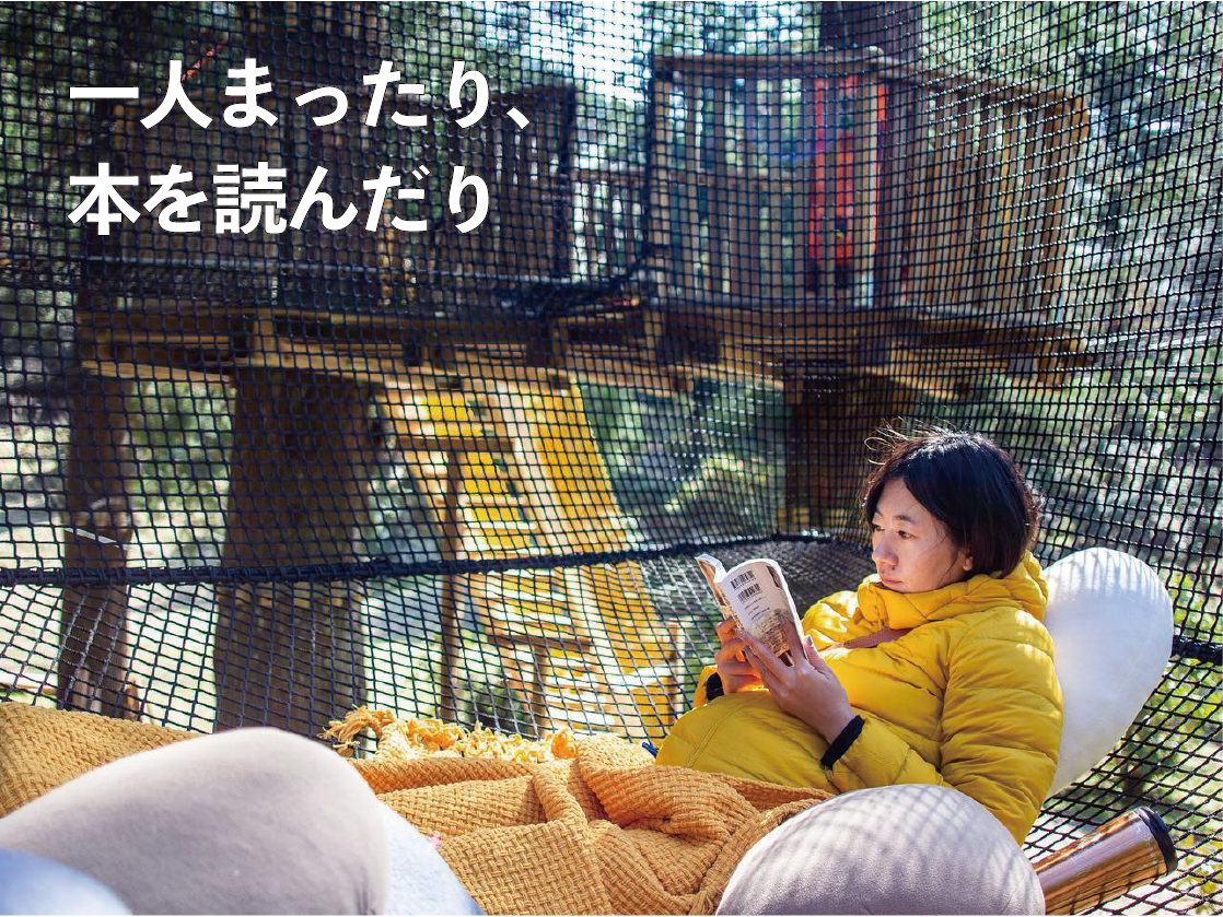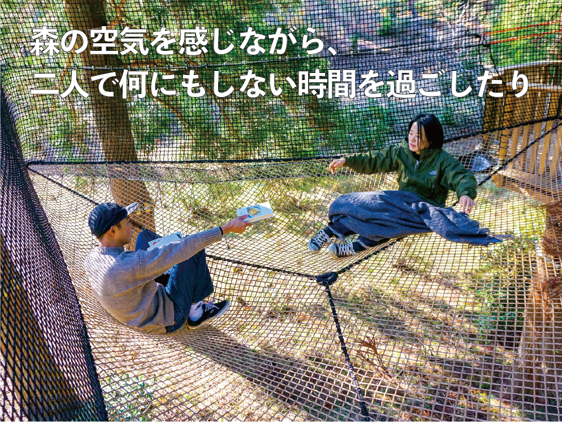 鳥たちと同じ高さに張られたソラカゴでは、風を感じて空を見上げて、本を読んだりお話ししたり、最高にくつろぐことができます。