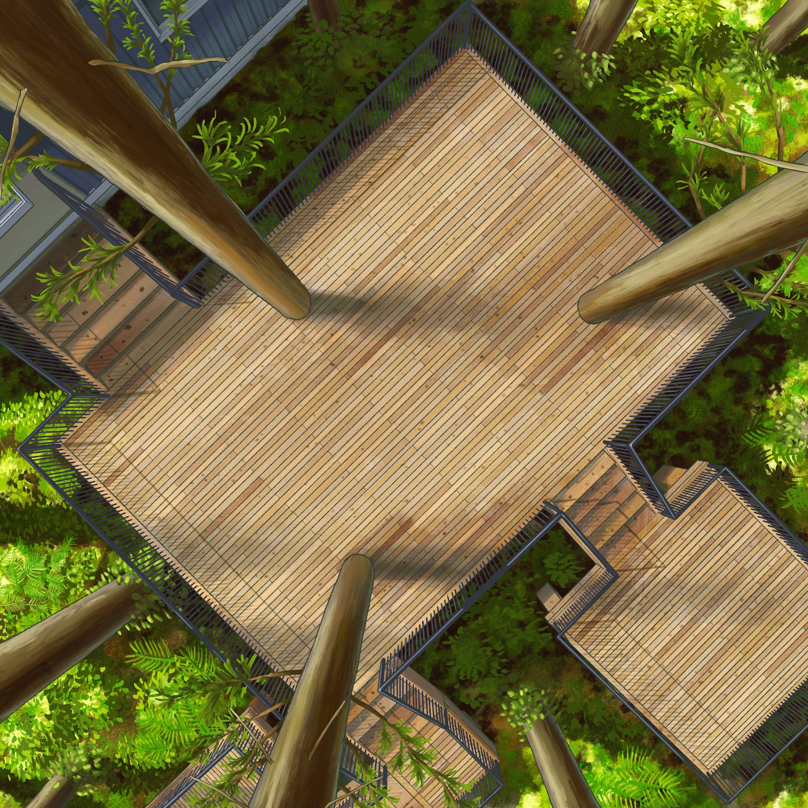 森をどんなふうにしようかなと考えている時に、奈良県十津川村の『空中の村』のことを知りました。木々の中にいくつもの大きなハンモック、それらが空中回廊みたいに繋がって、森の上に本当に空中の村ができていました!