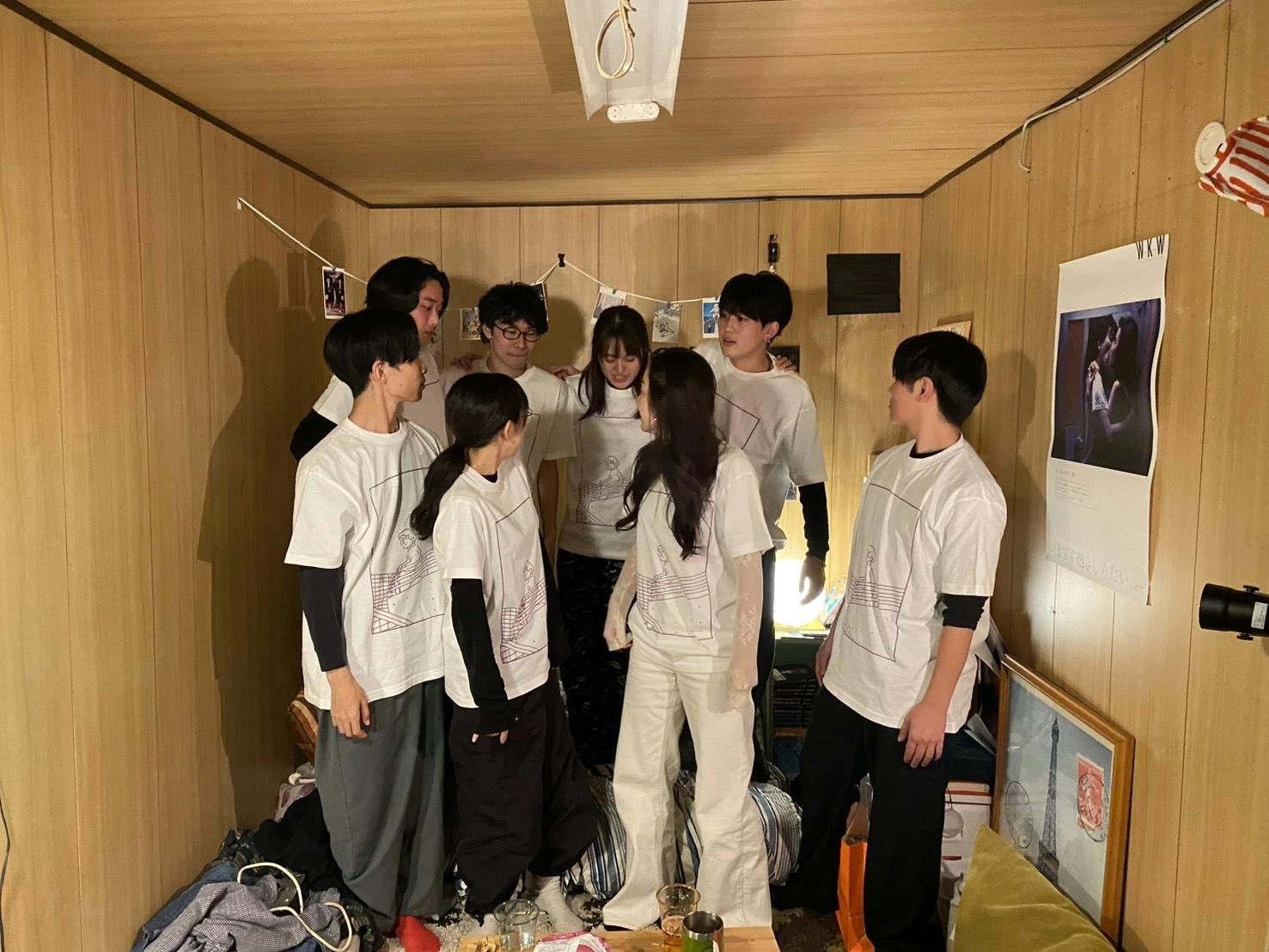 数日後の明け方には、光島叶倭によるおよそ30行以上の長台詞も撮影。プレハブ小屋が建てられている屋上部分、小屋の中で眠る一同を横目に主人公とミヤシロがカップラーメンの3分を待ちながら話している。きっと遠くの空が明け始めているのは良いけど、画として何かもうひとつ足りない気がする。そんな矢先ふと思いついた。ミヤシロの部屋にはプロジェクターがあり、それで自ら撮ったMVや短編映画を壁に投影している。そのプロジェクターを、眠っている柴田芹那(若きフォトグラファー・演、酒井美和)が寝返りを打ったタイミングで蹴飛ばしひっくり返り、プロジェクターからの映像が窓の向こう、屋上の壁に投影される。酒井美和はそういう空間を使う芝居に対しての勘が良く、眠りながらプロジェクターを蹴飛ばしてしまうカットも難なくこなしてくれる。よってミヤシロが熱い思いを語る屋上シーンには、ミヤシロが撮った短編映画の映像が壁に投影され、これまた印象的な仕上がり。映画は、思いつきと知恵で成り立っていると思わずにいられない。みんないつもありがとう。