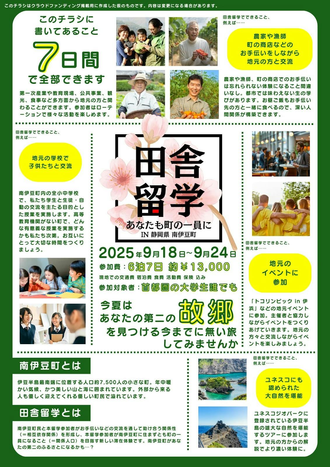 注意:本クラウドファンディングを通したご支援は、あくまで任意団体「田舎留学プロジェクト 運営局」に対するものであって、南伊豆町役場、早稲田大学、田舎留学プロジェクト事務局などは一切関係ございません。本クラウドファンディングによるご支援に対し、税制控除はありません。使途につきましては、任意団体「田舎留学プロジェクト 運営局」内での話し合いのもと、本施策の成功のために使用されます。なお、名称にはあらかじめご留意ください。
