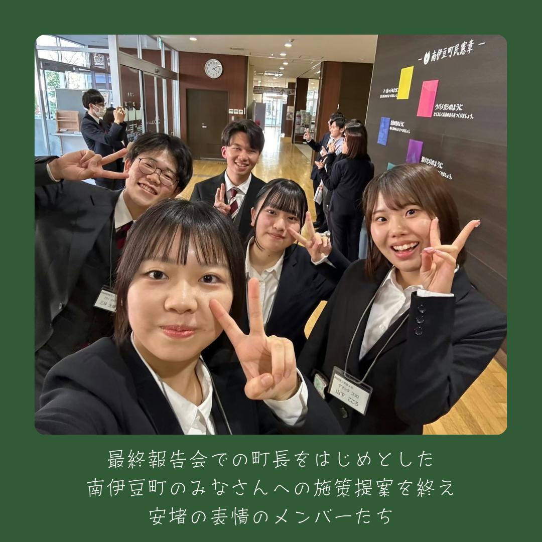 私たちは、南伊豆町役場より「観光客から”関係⼈⼝”へ 若者が南伊⾖に関わる施策を考えよう」というテーマを与えられ、町民や町内事業者のみなさんに対し、オンラインヒアリングや対面でのインタビュー、実地調査などを行い、町の特性の理解、問題の本質の特定、課題の根本的な解決のための施策の提案を行いました。ワークショップは約2ヶ月でしたが、ほぼ毎日ミーティングを行い、毎日南伊豆町と向き合いました。あるメンバーは町長に対し「ワークショップ期間中、私たちが東京で一番南伊豆町のことを考えていた自信がある」と豪語したほど。それはきっと間違いではない、と思うほど、頭の中は南伊豆町でいっぱい。この期間を通して、単にワークショップで学びたいということだけでなく、伊勢えびや金目鯛をはじめとした美味しいご飯、ユネスコジオパークにも登録されている豊かな自然、なにより行く度にあたたかく迎えていただく町のみなさんの虜になっていました。私たちは南伊豆町を「第二の故郷」のように想い、ワークショップ後も継続して町に関わり、自らも関係人口として貢献したいという想いが強くなりました。