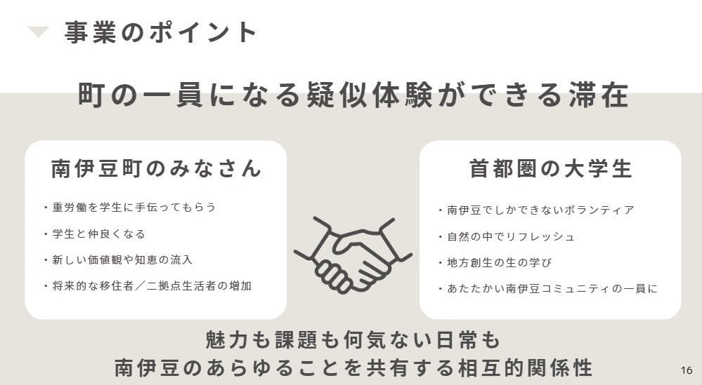 今年の夏に「つながる田舎留学」と題した30名の学生による町内での滞在イベントを企画しています。本イベントでは、南伊豆町の人のあたたかさや豊かな自然といった魅力は勿論、人口減やそれに伴った産業の衰退といった課題にも触れることができます。これまで南伊豆町と接点がなかった首都圏の大学生にとっては、本イベントが町との初めての出会いとなり、町や町民のみなさんとのご縁が広がる第一歩となるでしょう。こうした取り組みは、高い高齢化率や著しい人口減少という課題に直面している南伊豆町にとって、将来にわたり町を支える「関係人口」、いわば「住まずとも町の一員」の増加に直結することが期待されています。現在はその実施に向け、南伊豆町役場企画課地方創生室と密に連携し、準備を進めています。