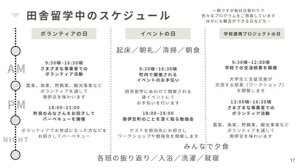 更に、南伊豆町役場、町民、そして参加メンバーにとって三方良しとなり、かつより本プロジェクトに参加する学生が関係人口になりやすいプログラムを構築することを目指し、以上にご紹介した25年9月の「つながる田舎留学」に加え、26年2月の「ふかめる田舎留学」や同窓会の実施、各種イベントへの南伊豆町ブースの出店など、通年でさまざまな施策を実施することを計画しています。その詳細につきましては、後述する【 さらに良い施策とするためにアップデート 】をご確認ください。