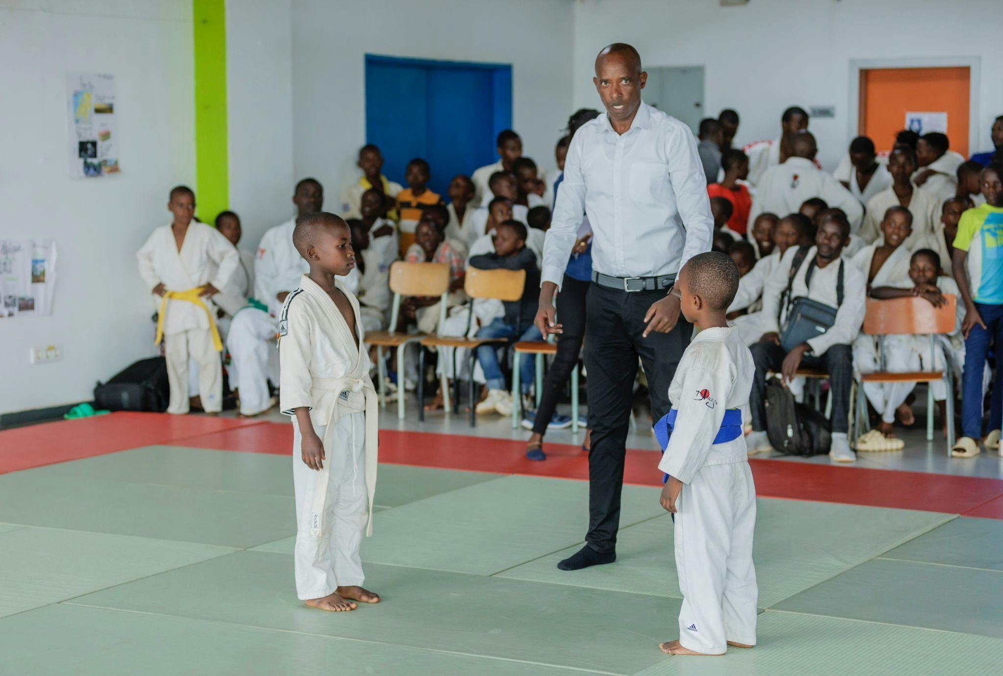 ルワンダには首都に3つ、難民キャンプに1つ道場があり全体で300人ほどの人数になります。私がメインで教えている道場は200人ほど子供達がおり、4つの道場の中で一番多いです。練習は週に4日で子供達の年齢、レベルによって練習の時間帯が分かれています。道場は日本でいう市民館のような場所を借りていて、室内の明かりは薄暗く、練習場所自体は広いのですが、畳はその半分ほどしかなく、あとのスペースは子供用のマットで代替して練習しています。子供達のレベルはというと、やはり高いレベルではなく、そもそも大人のコーチが常にいるわけではなく年長者がコーチとして子供たちに練習を教えていました。