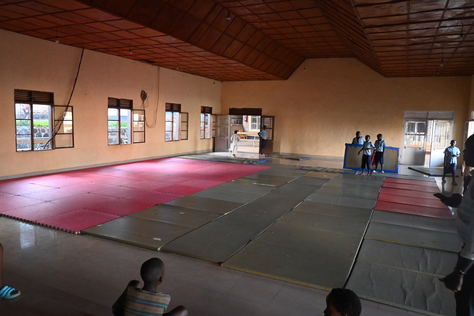 ルワンダには首都に3つ、難民キャンプに1つ道場があり全体で300人ほどの人数になります。私がメインで教えている道場は200人ほど子供達がおり、4つの道場の中で一番多いです。練習は週に4日で子供達の年齢、レベルによって練習の時間帯が分かれています。道場は日本でいう市民館のような場所を借りていて、室内の明かりは薄暗く、練習場所自体は広いのですが、畳はその半分ほどしかなく、あとのスペースは子供用のマットで代替して練習しています。子供達のレベルはというと、やはり高いレベルではなく、そもそも大人のコーチが常にいるわけではなく年長者がコーチとして子供たちに練習を教えていました。