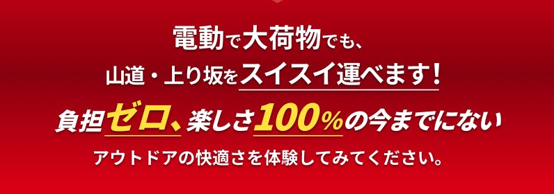 A:電動キャリーワゴンは、モーターを搭載したキャリーワゴンで、荷物の運搬をアシストする製品です。重い荷物でも少ない力でスムーズに運搬でき、キャンプ、アウトドア、買い物、物流などさまざまなシーンで活躍します。