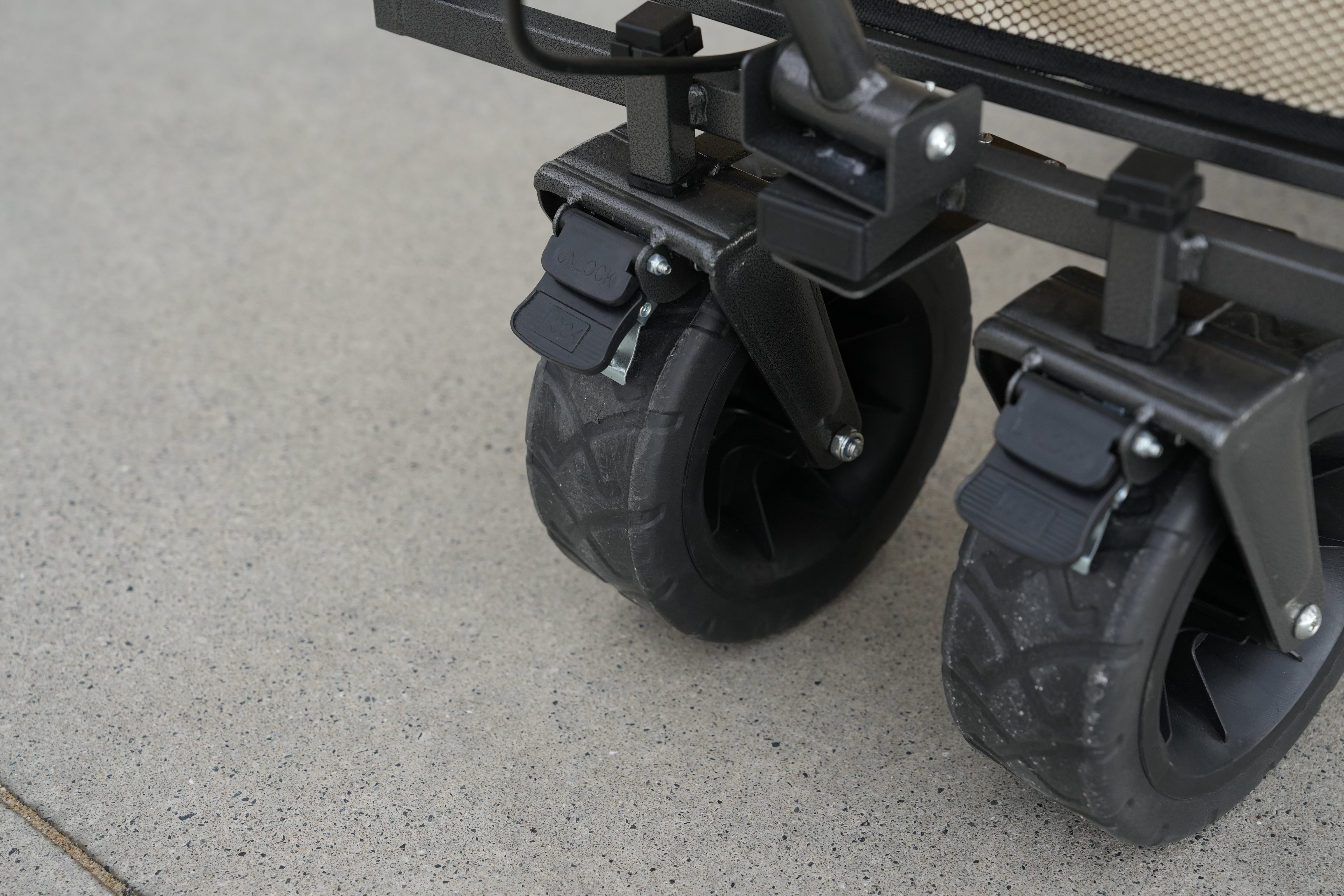 A:本製品はオールテレーンタイヤを採用しており、舗装道路・砂利道・芝生・キャンプ場・公園など様々な地形で使用可能です。ただし、極端にでこぼこした道や急な坂道では、走行が困難になる場合があります。