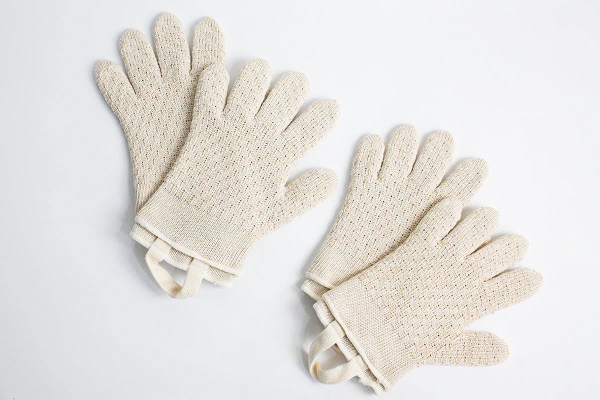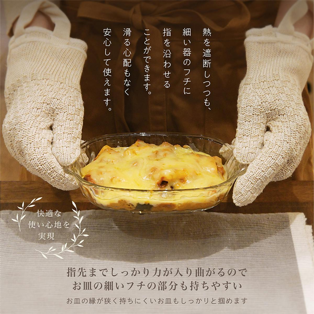 「小国杉の糸を使ったキッチンミトン」なら、5本指グローブタイプなので指先が自由にきき、片手でも力が入りやすいためフライパンなど片手で掴みたい時にも便利。
