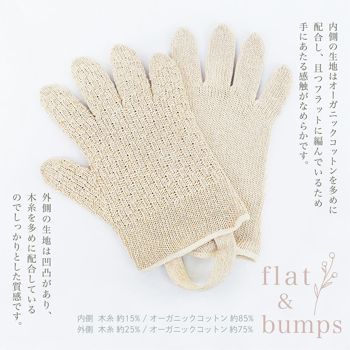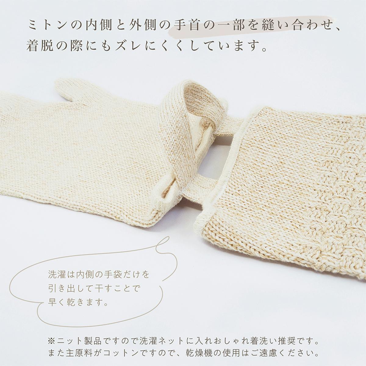 また二重構造の内側の生地は外側とは異なり木糸と綿糸の配合を調整し、フラットに編んでいるため、手にあたる感触もなめらか。内側の手袋は引き出すことができ、洗濯の際には乾きやすくなります。
