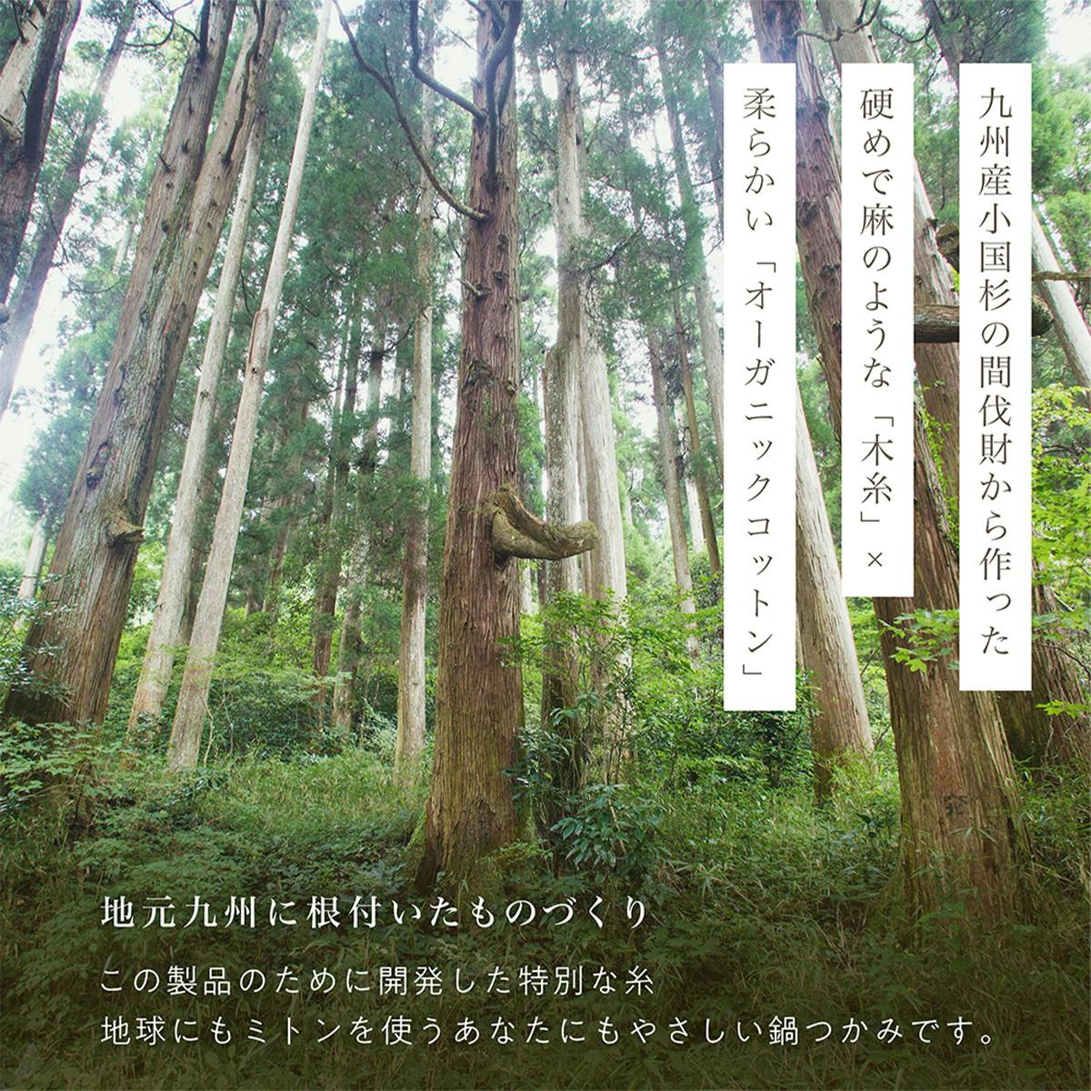 ◾️オーガニックコットンのやさしさと、熊本県小国町の森の間伐材から生まれた木糸(もくいと)の強さをあわせて編んだ、今までにない手触りのキッチンミトン