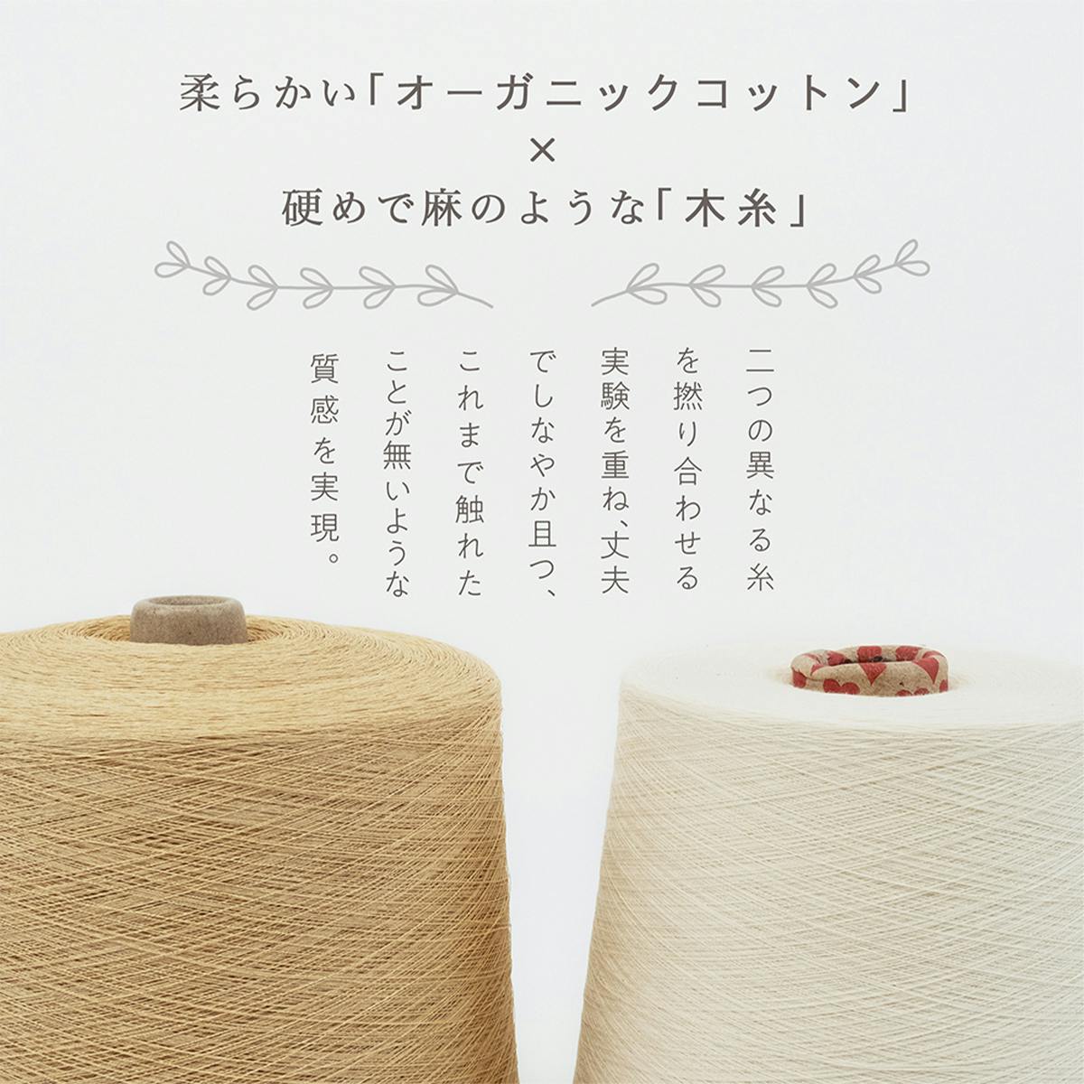 硬めで麻のような「木糸」と柔らかい「コットン糸」、2つの異なる糸を撚り合わせる実験を繰り返し、丈夫でしなやか且つ、今まで触れたことが無いような質感を実現しました。
