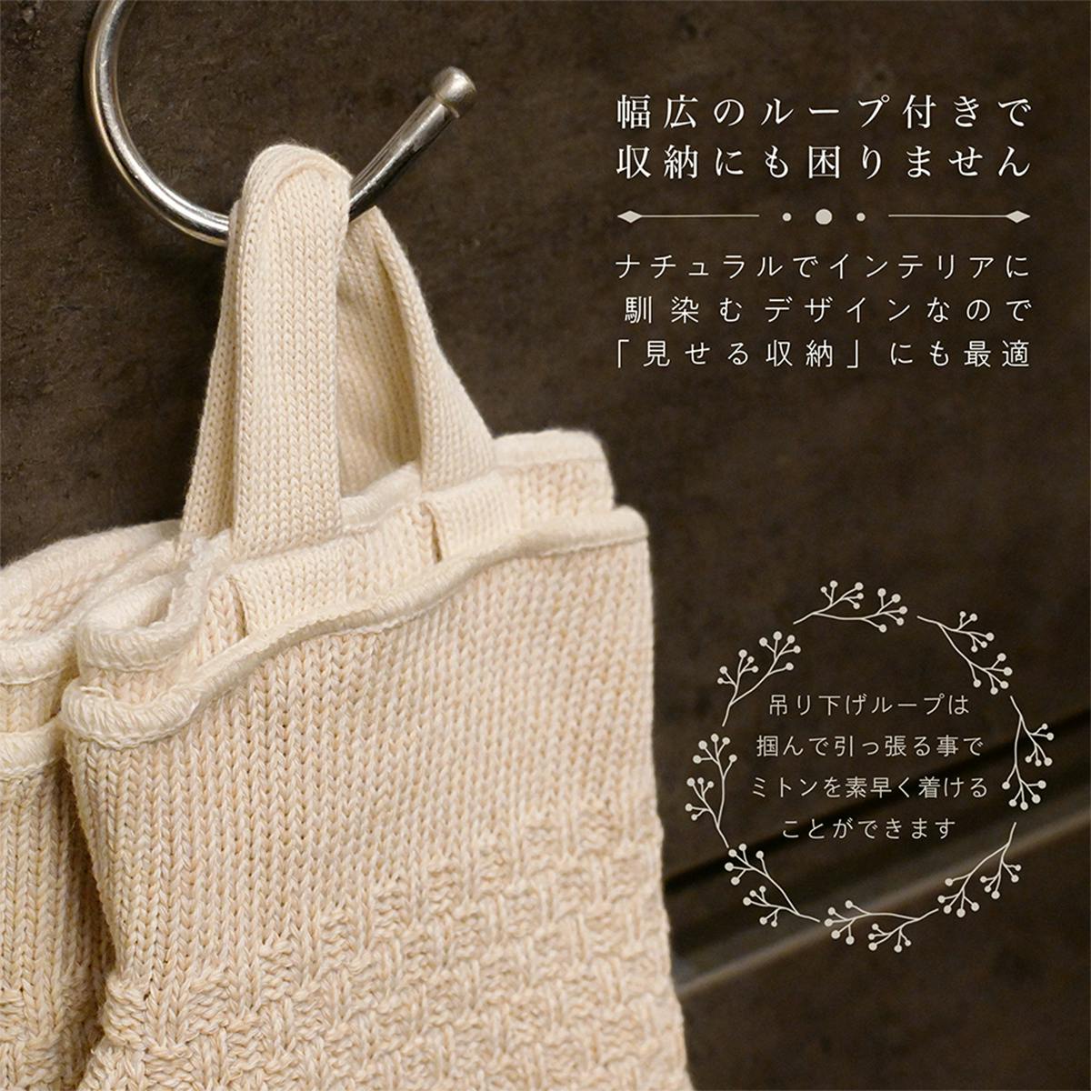 なにかと収納に工夫がいるキッチンでも、このキッチンミトンなら、ループ付きだから楽に吊り下げてスッキリとした収納が可能です。