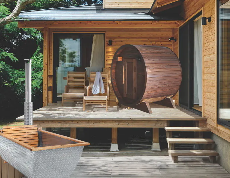 設置する浴槽は、移動も可能なHikki社製の「ボヘメン」を想定しています。薪に使用する木材は、水郷園の敷地内にある間伐材なども使用する予定です。お風呂の周りには、茨城県産の檜で作るサウナ「BURROW」(茨城木工株式会社)も設置して、自然と一体になる温浴空間を演出したいと考えています。