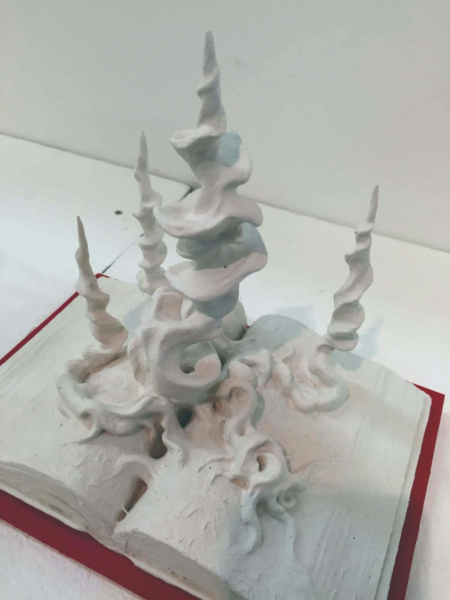 本の白いページから槍が渦巻いたようなものが突き出てます。作者の羅入氏は作品「般若の柱」の創作意図について