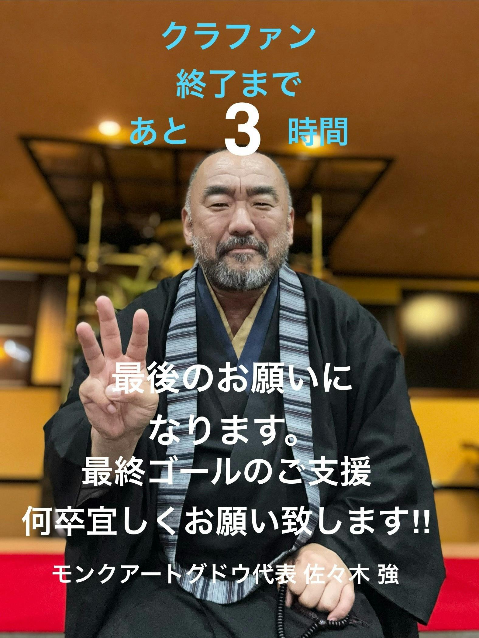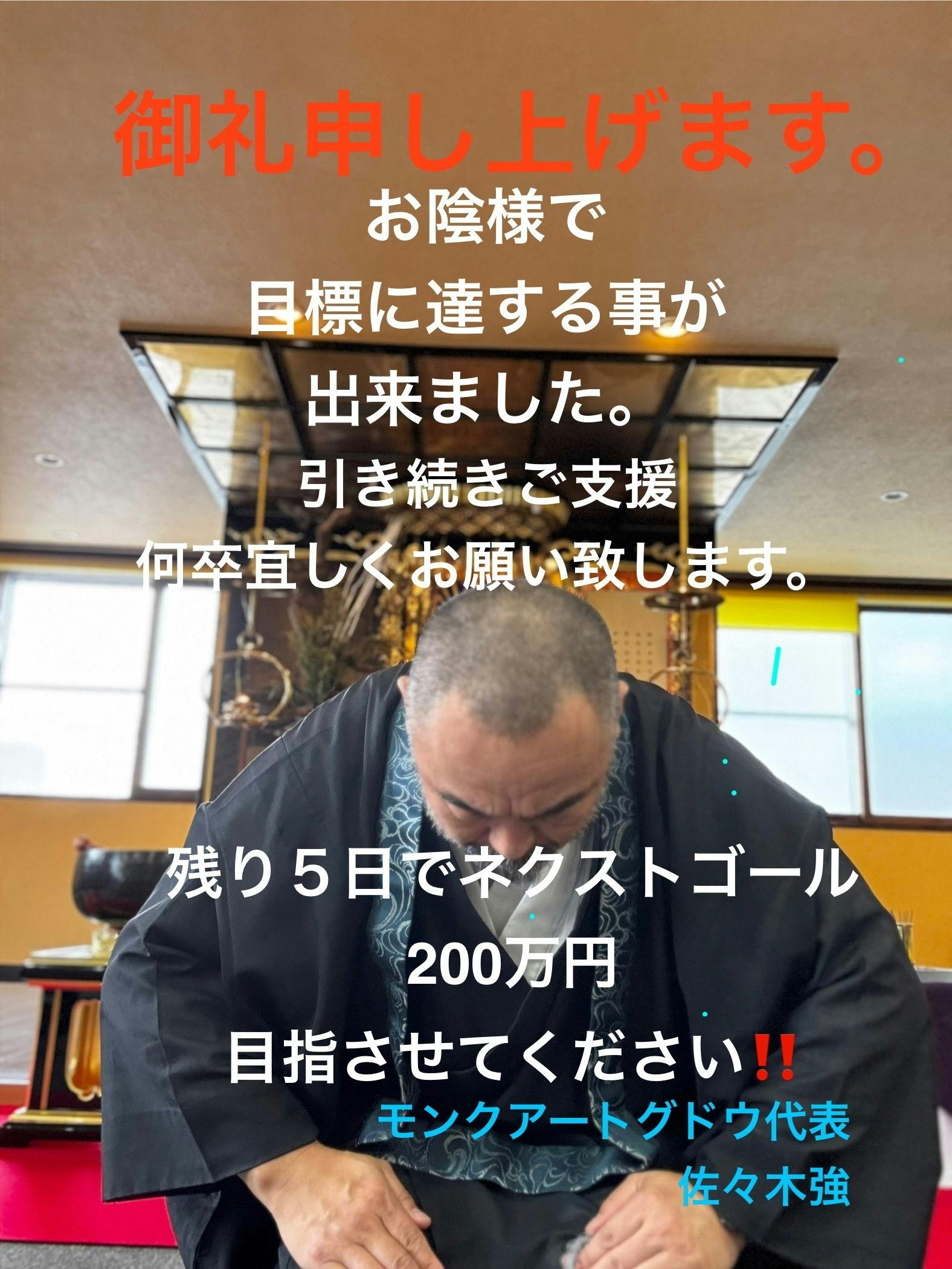 【御礼申し上げます】 プロジェクトオーナーのモンクアートグドウ代表 佐々木 強です。お陰様をもちまして、プロジェクトで掲げた目標金額を達成することが出来ました。まず以って皆様にご報告させていただきます。  皆様の温かいご支援を賜りまして、今回のプロジェクトが成功しました。心より感謝申し上げます。以下の通りのご支援金を頂きました。【ご支援金のご報告】現在の支援総額:1,532,000円支援者数:141名※詳細はこちらからご覧いただけます。https://camp-fire.jp/projects/830612/viewあらためて、たくさんの人たちに助けられてきたことを思わずにおれません。このご支援金を使わせて頂き、築地本願寺の展覧会では、僧侶アーティスト達による祈りと平和を願った作品表現を目一杯させて頂き、ご来場の皆様をお迎えしたいと思います。★プロジェクト終了後、支援者の皆様へ順次リターンのご対応をさせていただきます。改めて、ご支援いただきまして誠にありがとうございます。【更なるお願い】大変、図々しい、お願いになるかもしれません。更なる『ネクストゴール 200万円』を揚げさせて頂きたいのです。それは、このたくさんのご支援、願いを託されたモンクアートグドウ展の、次の開催の道です。この灯された火を、大きくは次世代に渡して行くべく、皆さんと一緒に創造したいのです。  どうか、残りの日数では、ネクストゴール200万円を実現させて頂けないでしょうか。何卒宜しくお願い致します。                 合掌 モンクアートグドウ代表 佐々木強