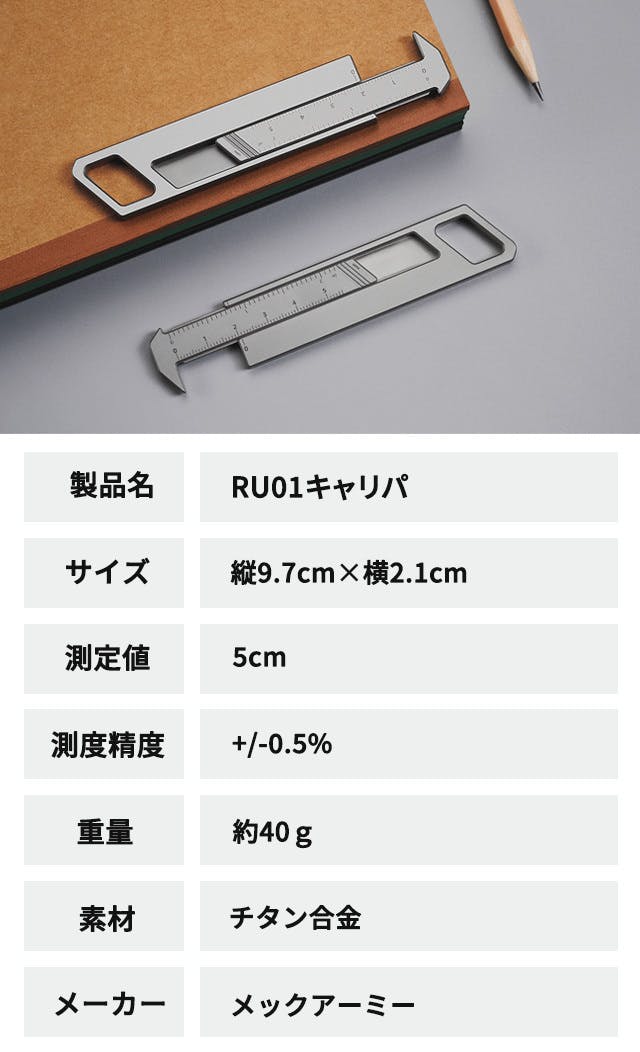 MecArmy RU01は、ネジなし構造のチタニウム製キャリパで軽量・コンパクトなチタン製の多機能ツールです。定規とキャリパの両方の使い方ができ、精密な測定が可能。わずか40gで携帯性に優れ、プロからDIY、日常使いまで幅広く活躍します。
