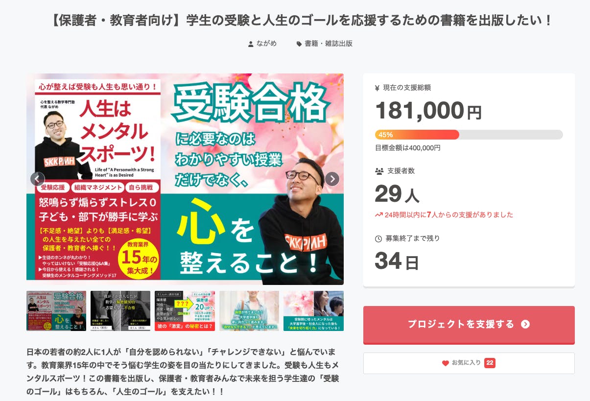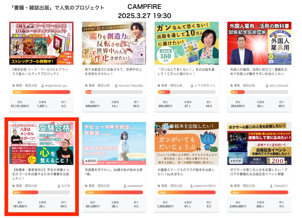クラウドファンディングサイトCAMPFIREの「書籍・出版部門」で5位となっています!ここまで押し上げていただけていて、めちゃくちゃ嬉しいです!「教育」で悩まれている保護者・教育者の方により届きやすくなっています!