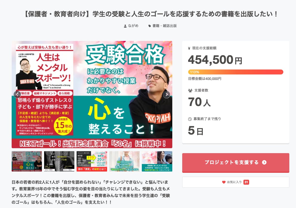 クラウドファンディング開始から32日が経過し、現在70名のあなたから454,500円のご支援をいただいております!