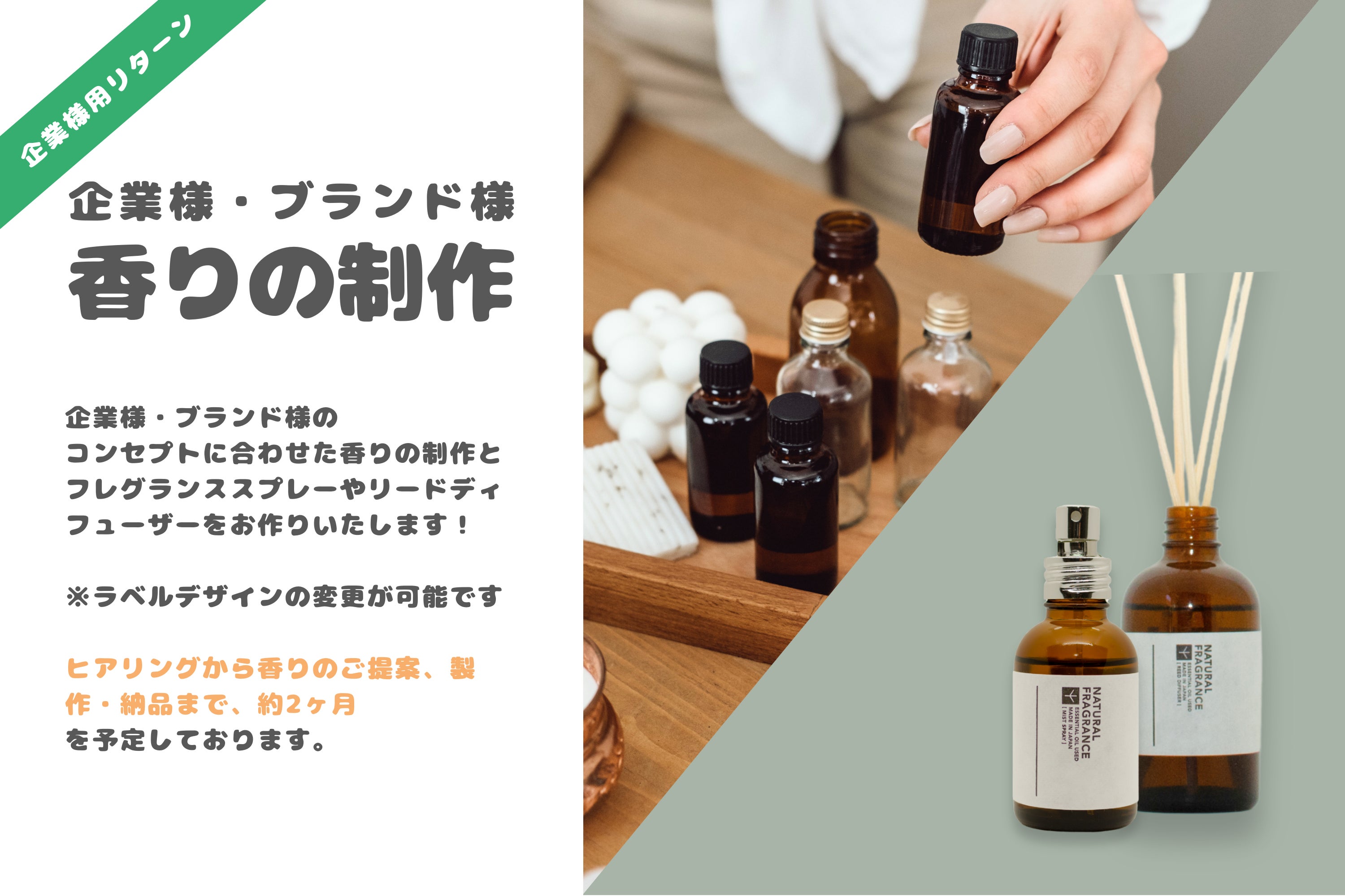 クラウドファンディング残り7日となりました!!!多くのご支援のおかげで目標金額は達成いたしましたが、ネクストゴール50人に向けて挑戦中です。そして、ネクストゴール達成までに必要なご支援者さまは、あと《22人》!ここまで応援してくださった皆さま、本当にありがとうございます。一つひとつの応援の言葉とご支援が、私たちの大きな力になっています。本日更新された企業様向けの追加リターンをご紹介させていただきます!▽リターン1オリジナル香り制作 + フレグランススプレー15本セット価格:225,000円・企業様・ブランド様のオリジナルの香りを制作・フレグランススプレー(天然精油100%使用)15本※ラベルデザインの変更が可能です(御社デザインの調整は無料/弊社でデザイン修正する場合は別途費用が発生いたします)ヒアリングから香りのご提案、製作・納品まで、約2ヶ月を予定しております▽リターン2オリジナル香り制作 + リードディフューザー12本セット価格:225,000円・企業様・ブランド様のオリジナルの香りを制作・リードディフューザー(天然精油100%使用・ラタンスティック付き)12本※ラベルデザインの変更が可能です(御社デザインの調整は無料/弊社でデザイン修正する場合は別途費用が発生いたします)ヒアリングから香りのご提案、製作・納品まで、約2ヶ月を予定しております。▽リターン3オリジナル香り制作 + フレグランススプレー15本 + リードディフューザー12本セット価格:400,000円・企業様・ブランド様のオリジナルの香りを制作・フレグランススプレー(天然精油100%使用)15本・リードディフューザー(天然精油100%使用・ラタンスティック付き)12本※ラベルデザインの変更が可能です(御社デザインの調整は無料/弊社でデザイン修正する場合は別途費用が発生いたします)ヒアリングから香りのご提案、製作・納品まで、約2ヶ月を予定しております。これからも、香りの力で想いを届けるお手伝いをしていきたいと思っております。ご興味のある企業様は、ぜひこの機会にご検討いただけましたら幸いです。皆さまからの応援やご支援一つひとつが、私たちの励みになっています。引き続きよろしくお願いします。
