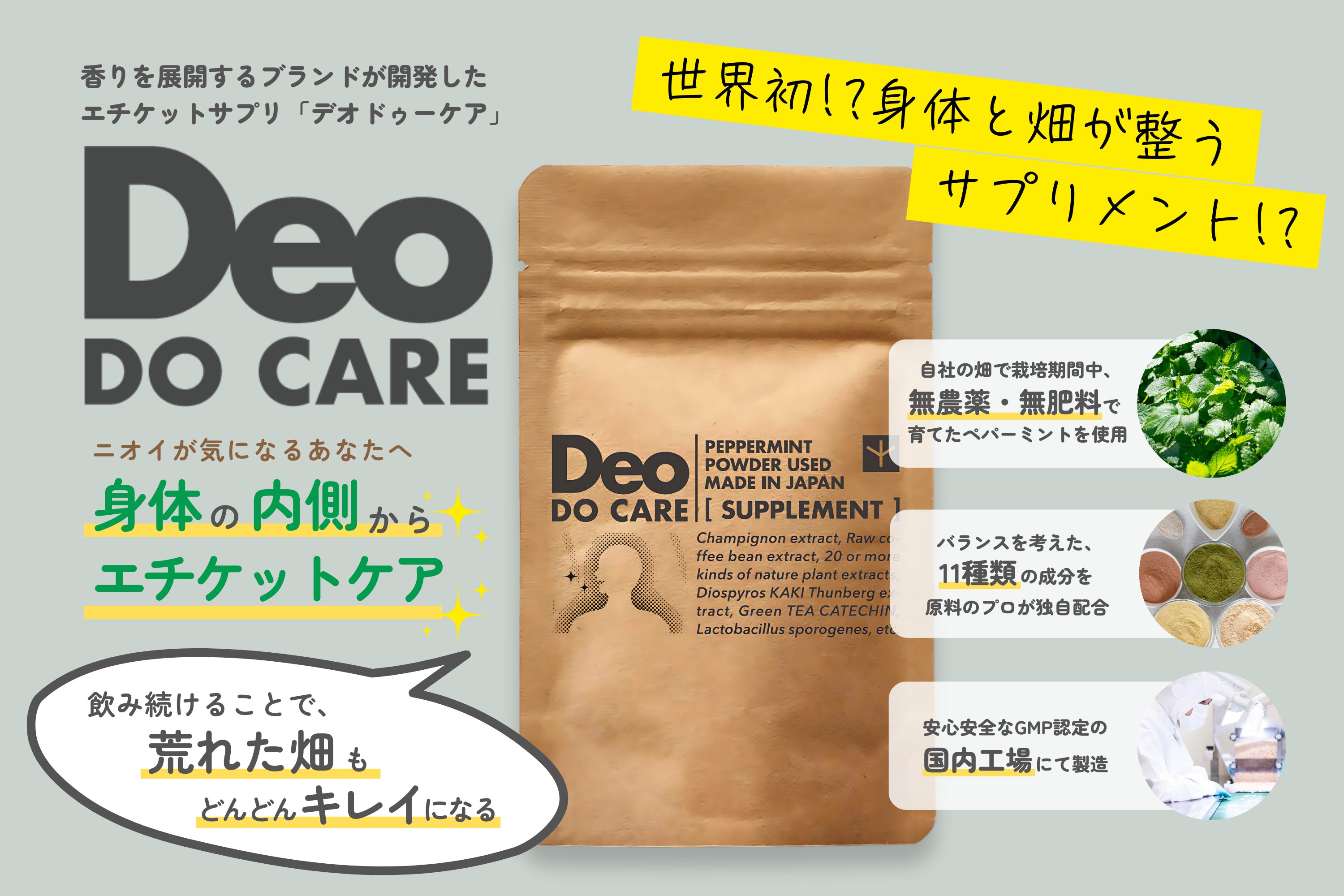 そんな口頭ベースのアドバイスだけではなく私たちが他にできることは何かないかと考え、自社の畑でフレグランスの原料に使用しようと栽培していたペパーミントを使用し、内側からサポートするサプリメント「DEO DO CARE」 を開発しました。