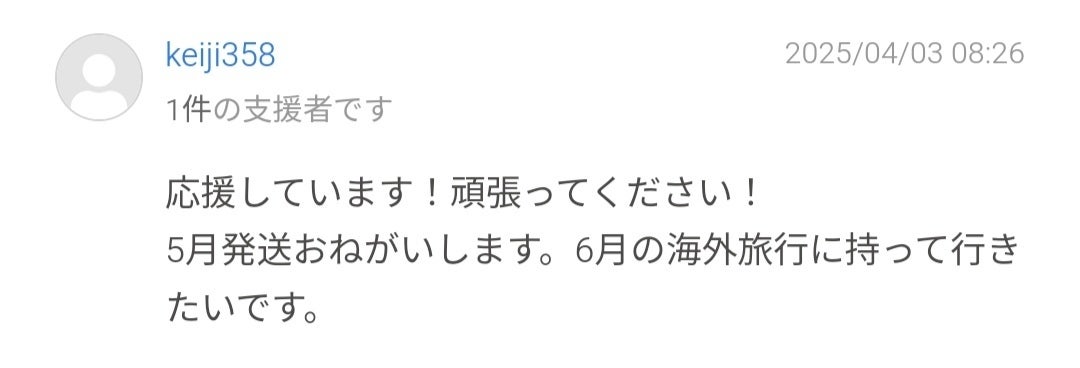 それ以外のリターン支援については早期配送などは対応しておりませんので、ご了承ご検討のほど、何卒よろしくお願いいたします。