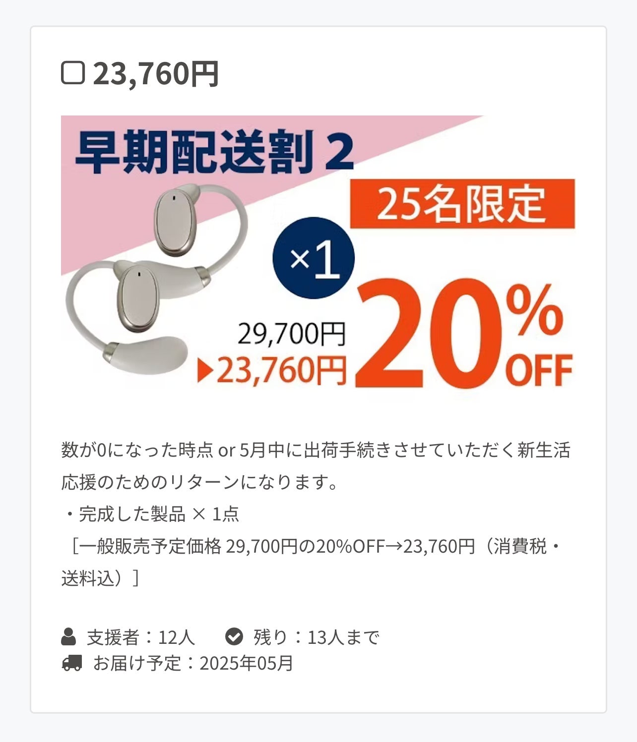 早期配送リターンも残りわずかですので、早めのご支援をお勧めします。
